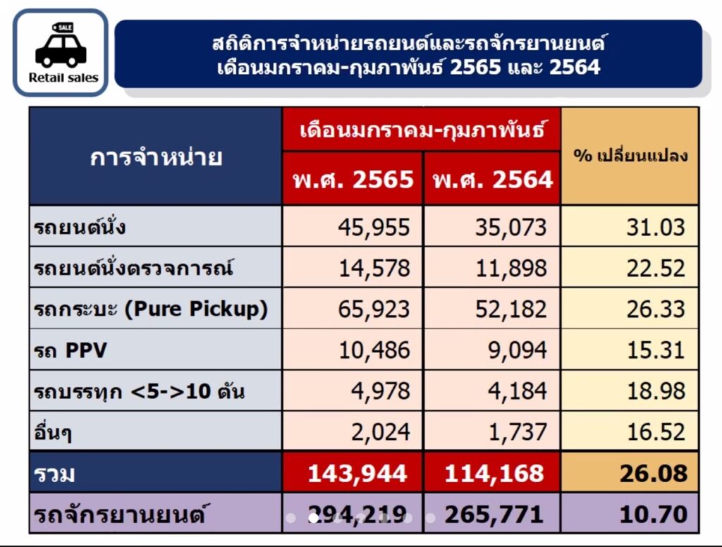 ยอดขายรถยนต์ภายในประเทศของเดือนกุมภาพันธ์ 2565 มีจำนวนทั้งสิ้น 74,489 คัน เพิ่มขึ้นจากเดือนมกราคม 2564 ร้อยละ 7.25 และเพิ่มขึ้นจากเดือนเดียวกันในปีที่แล้ว ร้อยละ 26.3 เพิ่มขึ้นจากการที่รัฐบาลอนุญาตให้จัดกิจกรรมด้านเศรษฐกิจมากขึ้น การช่วยเหลือผู้ได้รับผลกระทบจากโควิด 19 การรับประกันรายได้เกษตรกร การกระตุ้นเศรษฐกิจของรัฐบาลเช่นคนละครึ่ง เราเที่ยวด้วยกัน ฯลฯ การเปิดประเทศต้อนรับนักท่องเที่ยวจากต่างประเทศ การส่งเสริมการขายของผู้จำหน่ายรถยนต์ และงานบางกอก อินเตอร์เนชั่นแนล มอเตอร์ โชว์ จะช่วยเพื่มยอดขายรถยนต์ในเดือนมีนาคมและเมษายนโดยเฉพาะรถยนต์ไฟฟ้า