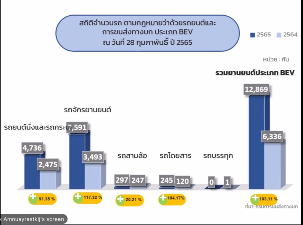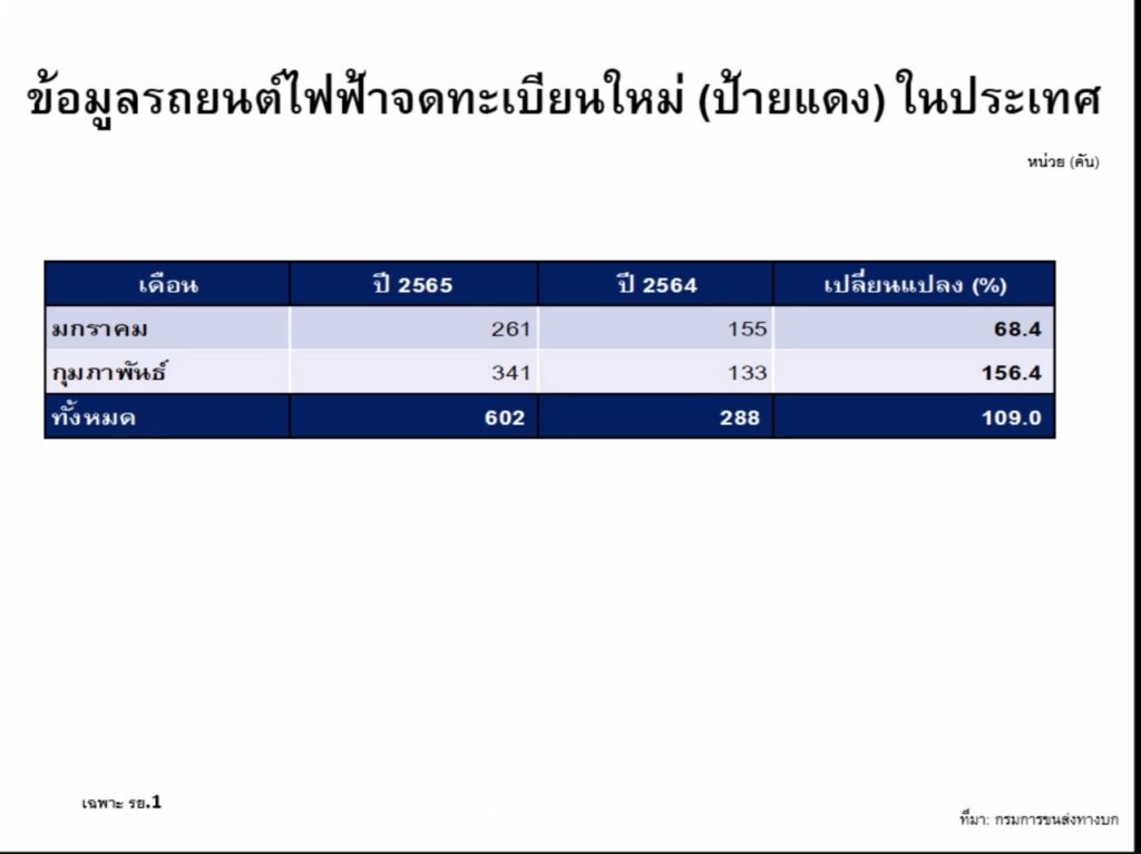 ส่วนยานยนต์ไฟฟ้าป้ายแดงประเภท BEV หรือรถยนต์ไฟฟ้า 100% เดือนกุมภาพันธ์ 2565 มีจดทะเบียนใหม่มีจำนวน 873 คัน เพิ่มขึ้นจากเดือนกุมภาพันธ์ปีที่แล้วร้อยละ 137.23 ทำให้ขณะนี้บ้านเรามียานยนต์ไฟฟ้า 100% ทั้งหมดจำนวน 12,869 คัน เพิ่มขึ้นจากปีที่แล้วร้อยละ 103.11 เป็นรถกระบถสูงสุด4,736 คัน รองลงมาเป็นรถยนต์นั่งมีจำนวน 4,598 คัน