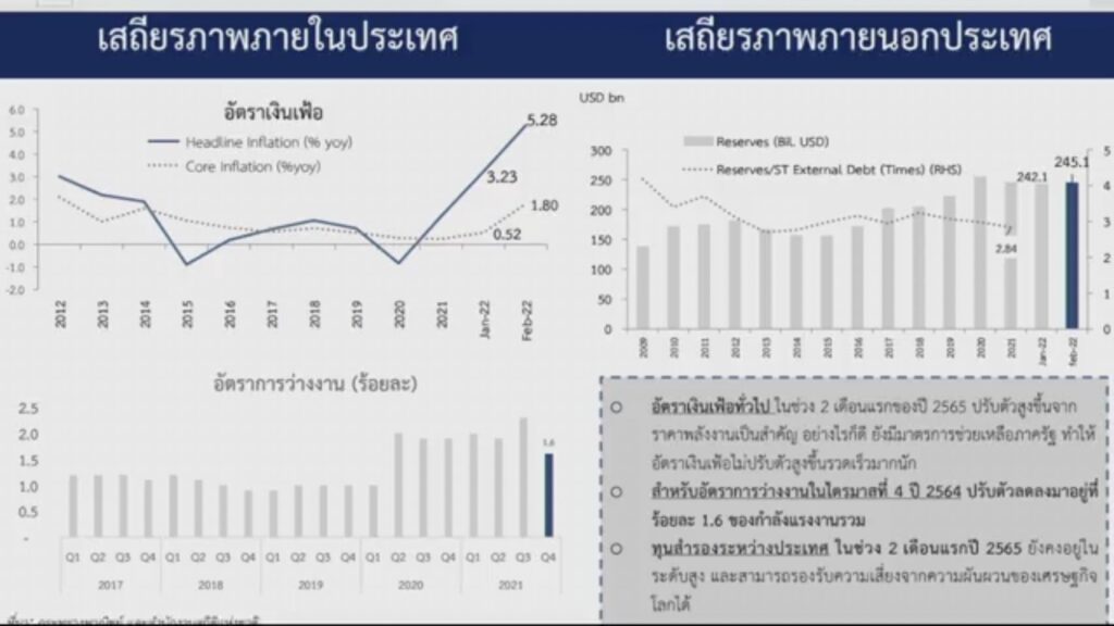 นายอาคม เติมพิทยาไพสิฐ รัฐมนตรีว่าการกระทรวงการคลัง กล่าวว่า ต้องจับตาดูการประชุม กนง. ในช่วงปลายเดือนมีนาคมนี้ เพราะปัจจุบันมีสภาพคล่องส่วนเกิน 2.5-3 ล้านล้านบาท ซึ่งทาง ธปท. และคลังได้ประสานงานอย่างใกล้ชิด ดังนั้น การปรับเพิ่มดอกเบี้ยนโยบายจึงต้องพิจารณาหลายปัจจัย เพราะอัตราเงินเฟ้อไทยมีสาเหตุจากต้นทุน ขณะที่ประเทศพัฒนาแล้ว มีปัญหาอัตราเงินเฟ้อจากความต้องการในประเทศในการซื้อสินค้า เพราะรัฐบาลหลายประเทศได้อัดฉีดเงินออกสู่ระบบเติมกำลังซื้อ ในส่วนของไทย อัตราเงินเฟ้อหากไม่รวมกลุ่มพลังงงานและอาหาร สูงร้อยละ 5 รัฐบาลจึงต้องดูแลต้นทุนค่าครองชีพผ่าน 10 มาตรการ จึงต้องใช้นโยบายการคลังประคองเศรษฐกิจให้ฟื้นตัว