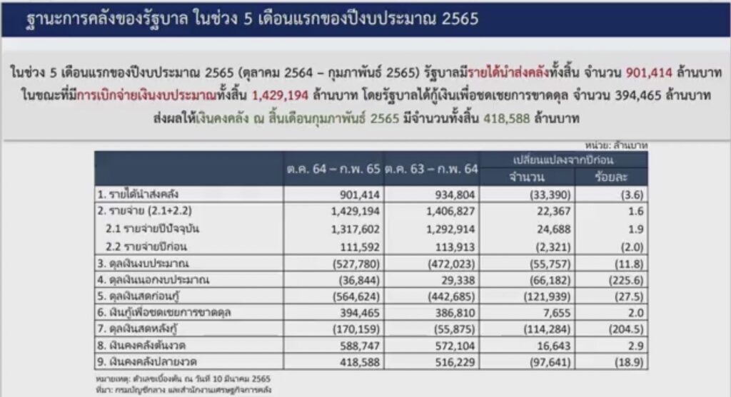 ทั้งนี้ การจัดทำงบประมาณปี 2565 ขาดดุลจำนวน 7 แสนล้านบาท ขณะที่การจัดเก็บรายได้ของรัฐบาล 5 เดือนแรกยังทำได้ตามเป้าหมาย และต้องติดตามรายได้ในช่วงเดือน เม.ย.-พ.ค.65 รายได้ภาษีจะชัดเจนมากขึ้น จากการยื่นแบบภาษีของบุคคลธรรมดาในปี 2564 และนิติบุคคลในปี 2565 ยังคาดการณ์ว่าจัดเก็บรายได้ในปี 2565 จำนวน 2.4 ล้านล้านบาท จะทำได้ตามเป้าหมาย โดยเฉพาะการยื่นแบบภาษีภาคเอกชนผู้ให้บริการ E-Service จากการค้าผ่านออนไลน์สูงถึง 3,000 ล้านบาท ขณะที่ทุนสำรองระหว่างประเทศสูงถึง 2.45 แสนล้านดอลลาร์สหรัฐ นับว่าฐานะทางการคลังของรัฐบาลยังมั่นคง.-สำนักข่าวไทย