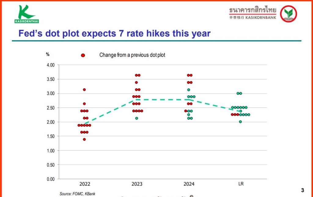 นางสาวกฤติกากล่าวว่า ธนาคารกลางสหรัฐ (Fed) อาจจะใช้วิธีแก้ปัญหาเงินเฟ้อตามวิธีที่เคยปฏิบัติมาซึ่งอาจจะบรรเทาปัญหาเงินเฟ้อได้ แต่จะเพิ่มความเสี่ยงที่เศรษฐกิจจะเข้าสู่ภาวะถดถอย อีกทั้งนโยบายเศรษฐกิจและนโยบายการเงินของ Fed ในการขึ้นดอกเบี้ยและการปรับอัตราดอกเบี้ย (Dot Plot) ท่ามกลางภาวะสงครามยูเครนจะส่งผลถึงตลาดการเงินโลก