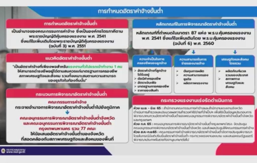 ส่วนความคืบหน้าการขึ้นค่าแรงขั้นต่ำ กระทรวงแรงงานได้เร่งรัดติดตามการดำเนินการมาตลอด ซึ่งอัตราค่าจ้างขั้นต่ำของประเทศไทยไม่ได้อยู่ในระดับต่ำ หรือกลาง หากเทียบกับประเทศคู่แข่งที่สำคัญด้านการลงทุนในเอเชียตะวันออกเฉียงใต้ ไทยเป็นรองแค่บรูไน สิงคโปร์ และมาเลเซีย และการขึ้นค่าแรงในแต่ละครั้งนั้น มีคณะกรรมการค่าจ้าง(บอร์ดค่าจ้าง) ที่เป็นคณะกรรมการไตรภาคี 3 ฝ่าย ประกอบด้วย ฝ่ายนายจ้าง ฝ่ายลูกจ้าง และฝ่ายรัฐบาล ตามพ.ร.บ.คุ้มครองแรงงาน พ.ศ.2551 ตามเกณฑ์การพิจารณาเกี่ยวกับ ดัชนีค่าครองชีพ อัตราเงินเฟ้อ มาตรฐานการครองชีพ ผลิตภัณฑ์มวลรวมของประเทศ และสภาพทางเศรษฐกิจและสังคม สอดคล้องกับมาตรฐานสากลและตามหลักการของไอแอลโอ (ILO) ทั้งนี้ ในห้วงเดือนเมษายน – มิถุนายน 2565 อยู่ในขั้นตอนที่สำนักงานคณะกรรมการค่าจ้างและสำนักงานแรงงานจังหวัดดำเนินการสำรวจและประมวลผลค่าใช้จ่ายที่จำเป็น เพื่อใช้เป็นข้อมูลประกอบการพิจารณาทบทวนอัตราค่าจ้างขั้นต่ำของคณะอนุกรรมการพิจารณาอัตราค่าจ้างขั้นต่ำจังหวัดและกรุงเทพมหานครจากนั้นในเดือนกรกฎาคม 2565 คณะอนุกรรมการพิจารณาอัตราค่าจ้างขั้นต่ำจังหวัด และกรุงเทพฯ จะจัดประชุมพิจารณาอัตราค่าจ้างขั้นต่ำจังหวัด และส่งผลประชุมให้คณะกรรมการค่าจ้าง ก่อนที่จะให้คณะกรรมการค่าจ้างพิจารณาอัตราค่าจ้างขั้นจัดการประชุมพิจารณาในเดือนสิงหาคม-กันยายน 2565 ในกรณีมีมติปรับขึ้นอัตราค่าจ้างขั้นต่ำ กระทรวงแรงงานจะลงนามเสนอคณะรัฐมนตรี (ครม.) พิจารณาประกาศในราชกิจจานุเบกษาต่อไป