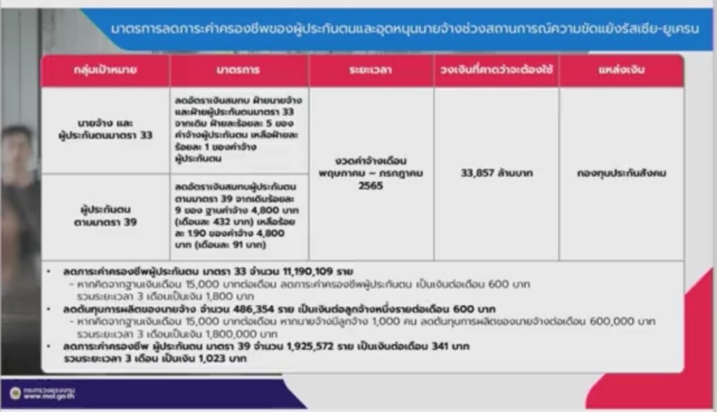 นายสุชาติ ชมกลิ่น รัฐมนตรีว่าการกระทรวงแรงงาน เผย กระทรวงแรงงานมีมาตรการช่วยเหลือผู้ประกันตน จากสถานการณ์สงครามรัสเซีย-ยูเครน ว่า จะลดเงินสมทบนายจ้างและผู้ประกันตนมาตรา 33 จำนวน 11.2 ล้านคน จากเดิมฝ่ายละ 5% ของค่าจ้างผู้ประกันตน เหลือ 1% เป็นเวลา 3 เดือน (งวดค่าจ้าง พ.ค.-ก.ค.) โดยคาดว่าจะใช้วงเงิน 33,857 ล้านบาท