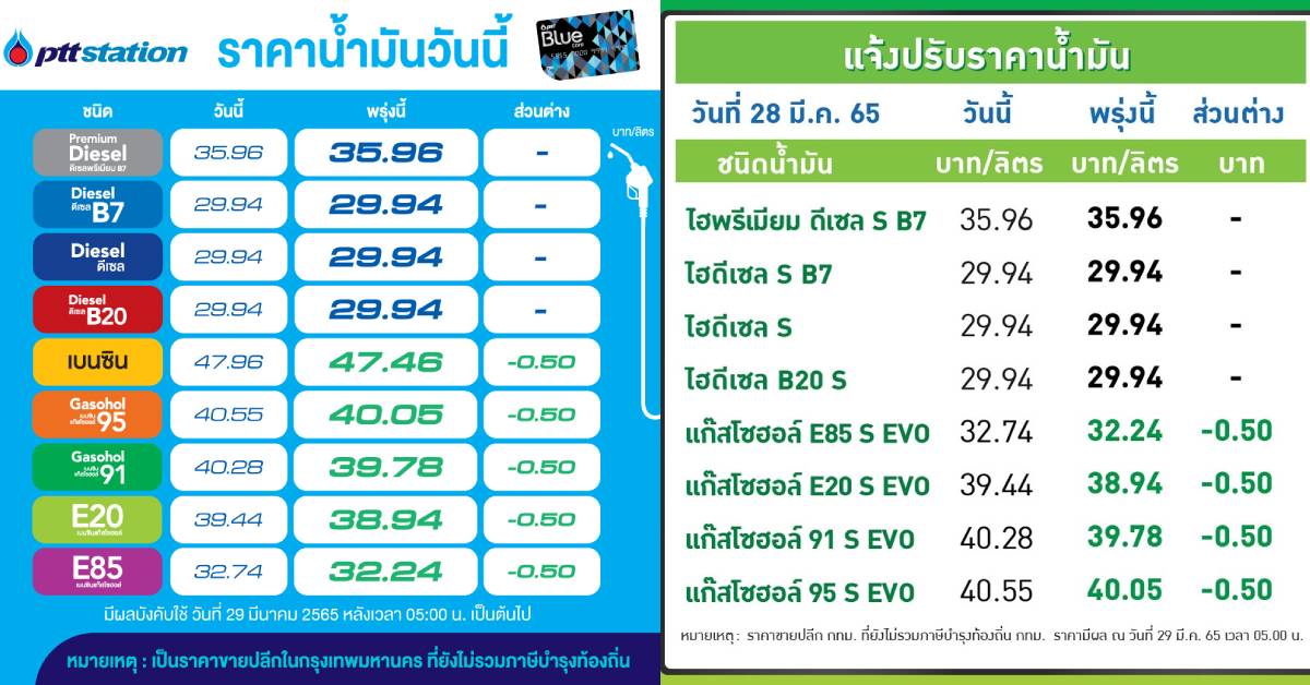 โดยราคาขายปลีกจะเป็นดังนี้ ULG = 47.46, GSH95 = 40.05, E20 = 38.94, GSH91 = 39.78, E85 = 32.24, HSD- B7= 29.94, HSD-B10 = 29.94, HSD-B20=29.94,ดีเซลพรีเมี่ยม B7 = 35.96 บาทต่อลิตร โดยราคาขายปลีกข้างต้นยังไม่รวมภาษีบำรุงกรุงเทพมหานคร.-สำนักข่าวไทย