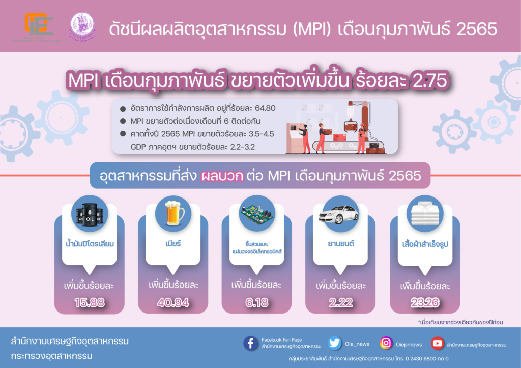 นายสุริยะ จึงรุ่งเรืองกิจ รัฐมนตรีว่าการกระทรวงอุตสาหกรรม (อก.) เปิดเผยว่า เศรษฐกิจภาคอุตสาหกรรมไทยขยายตัวใกล้เคียงกับช่วงก่อนหน้าสถานการณ์แพร่ระบาดของโรคโควิด-19 โดยดัชนีผลผลิตอุตสาหกรรม (MPI) เดือนกุมภาพันธ์ 2565 อยู่ที่ 102.00 ขยายตัวร้อยละ 2.75 เมื่อเทียบกับช่วงเดียวกันของปีก่อน ขยายตัวต่อเนื่องเป็นเดือนที่ 6 นับตั้งแต่เดือนกันยายน 2564 ด้านอัตราการใช้กำลังการผลิตอยู่ที่ร้อยละ 64.80 นอกจากนี้ สำนักงานเศรษฐกิจอุตสาหกรรม (สศอ.) ได้ประมาณการ MPI ปี 2565 ขยายตัวร้อยละ 3.5 – 4.5 และ GDP ภาคอุตสาหกรรมขยายตัวร้อยละ 2.2 – 3.2