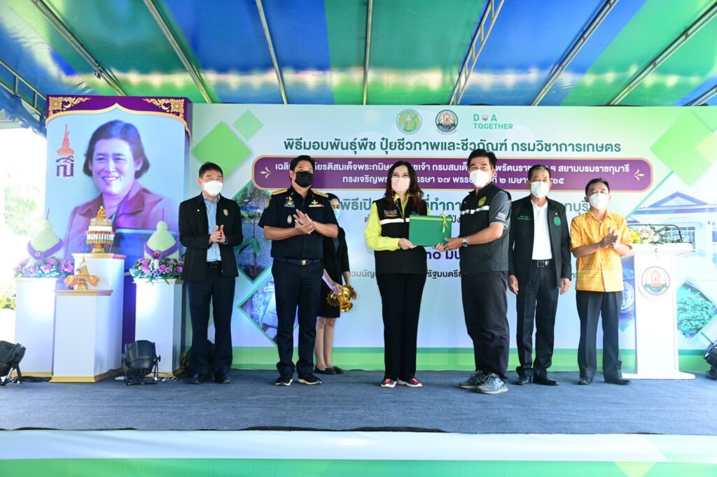 โอกาสนี้ รมช.มนัญญาเป็นประธานในการมอบพันธุ์พืช ชีวภาพและชีวภัณฑ์จากกรมวิชาการเกษตรเพื่อเฉลิมพระเกียรติ สมเด็จพระกนิษฐาธิราชเจ้า กรมสมเด็จพระเทพรัตนราชสุดาฯ สยามบรมราชกุมารีที่ทรงเจริญพระชนมพรรษา 67 พรรษาในวันที่ 2 เมษายน 2565