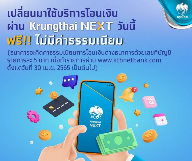 ธนาคารกรุงไทยประกาศคิดค่าโอนเงินต่างธนาคารผ่าน KTB netbank รายการละ 5 บาท ตั้งแต่วันที่ 30 เมษายน 2565 เป็นต้นไป พร้อมเชิญชวนลูกค้าเปลี่ยนมาใช้บริการ Krungthai NEXT แอปพลิเคชันทางการเงินที่ตอบโจทย์ลูกค้าทุกกลุ่ม ทำให้ใช้ชีวิตเก่งขึ้น ง่าย รวดเร็ว และปลอดภัย ฟรี ไม่มีค่าบริการ