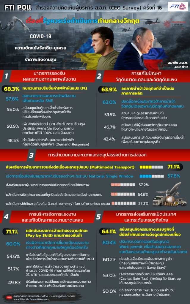 จากการสำรวจความเห็นจากสมาชิก ส.อ.ท. เกี่ยวกับข้อเสนอที่ภาครัฐควรเร่งดำเนินการใน 5 เรื่อง ซึ่งมีผู้ตอบแบบสำรวจ จำนวน 460 ท่าน ครอบคลุมผู้ประกอบการจาก 45 กลุ่มอุตสาหกรรม และ 76 สภาอุตสาหกรรมจังหวัด มีสรุปผลการสำรวจ FTI Poll ครั้งที่ 16 จำนวน 5 คำถาม ดังนี้