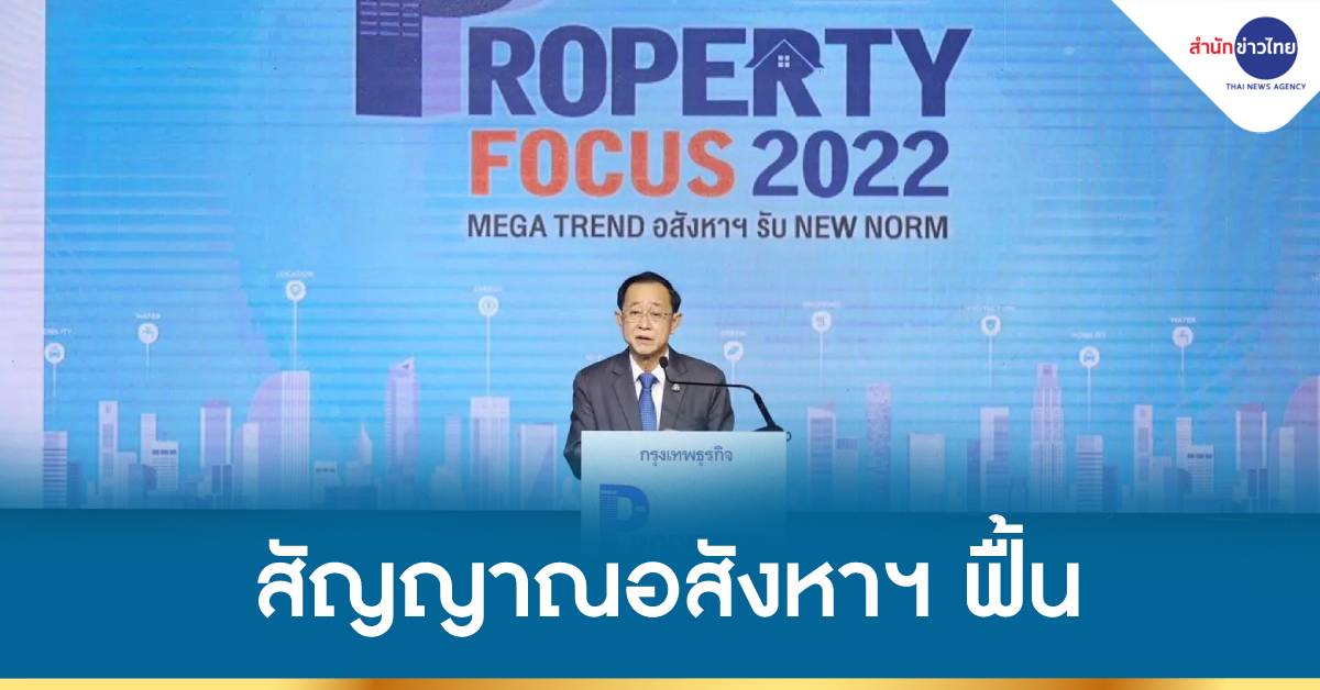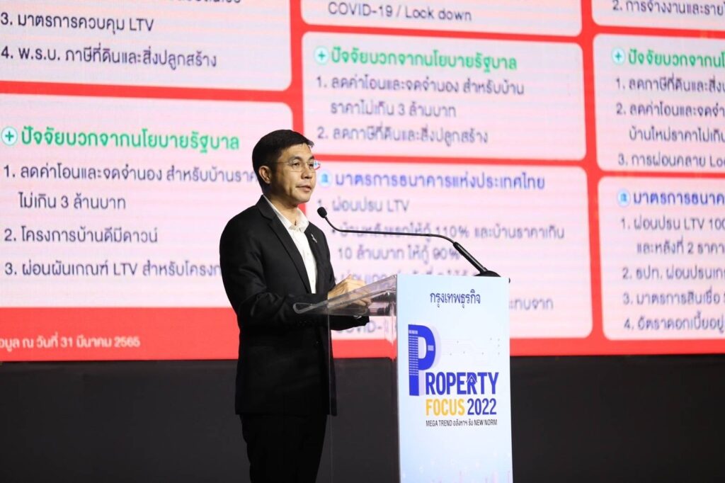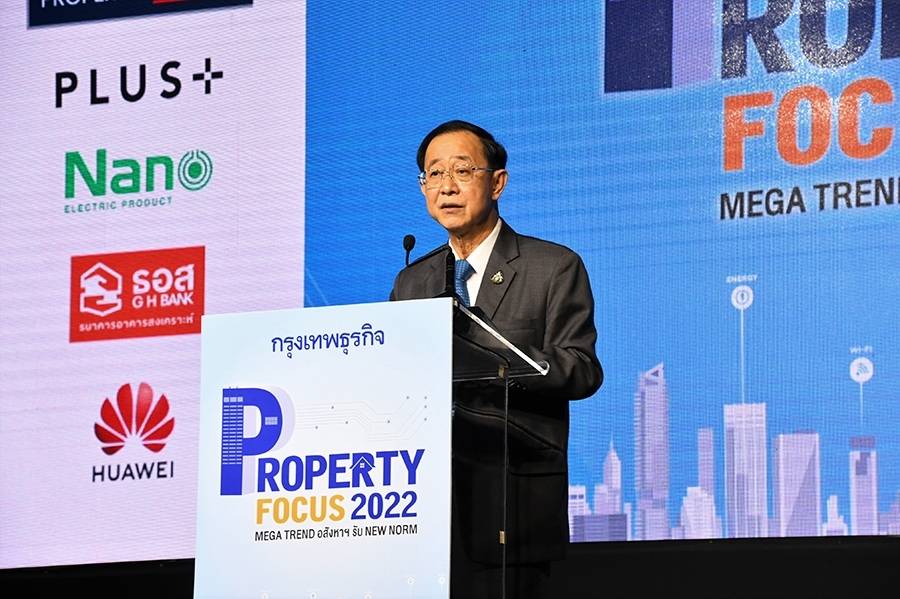 นายอาคม เติมพิทยาไพสิฐ รัฐมนตรีว่าการกระทรวงการคลัง ปาฐกถาพิเศษ ในงานสัมมนา Property Focus 2022 จัดโดย นสพ.กรุงเทพธุรกิจ ว่า ท่ามกลางปัญหาโควิด -19 กลับเริ่มเห็นสัญญาการฟื้นตัวของภาคอสังหาริมทรัพย์ฯ เพราะแนวโน้มดอกเบี้ยขยับเพิ่ม ทำให้คนมีทุนในกระเป๋าบางส่วนเร่งตัดสินใจซื้อบ้าน ขณะที่เงื่อนไขแบงก์รัฐจูงใจให้คนซื้อบ้าน จึงส่งผลต่อเนื่องไปยังภาคก่อสร้าง กลุ่มเฟอร์นิเจอร์ ตกแต่งบ้าน เมื่อรวมทุกกลุ่มมีสัดส่วนสูงถึงร้อยละ 10 ของจีดีพี ดังนั้นเมื่ออสังหาฯมีแนวโน้มฟื้นตัว ทำให้อุตสาหกรรมอื่นฟื้นตัวตามไปด้วย หลังได้หารือกับกลุ่มผู้ส่งออก หากช่วยผลักดันให้การส่งออกทั้งปีขยายตัวร้อยละ 10 จะทำให้จีดีพีทั้งปี 65 ขยายตัวได้ร้อยละ 3.5-4.5 ขณะที่หลายองค์กรโดยเฉพาะต่างชาติยังมองว่าเศรษฐกิจไทยยังขยายตัวเกินร้อยละ 4