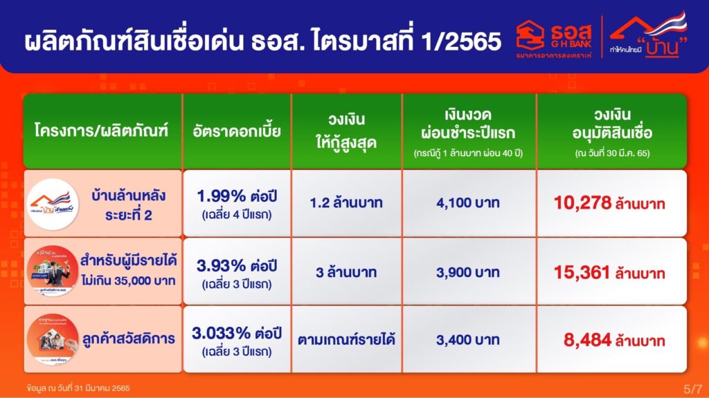 นายฉัตรชัย ศิริไล กรรมการผู้จัดการ ธนาคารอาคารสงเคราะห์ (ธอส.) กล่าวว่า ยอดสินเชื่อไตรมาส 1 ของปี 65 ยอมรับว่าตัวเลขสินเชื่อปล่อยใหม่สูงมาก 62,000 ล้านบาท ส่วนใหญ่ไตรมาสแรกของทุกปี จะเป็นช่วงปล่อยสินเชื่อได้ต่ำสุด เมื่อภาคอสังหาริมทรัพย์ฯ มีสัญญาณฟื้นตัว แรงซื้อบ้านเพิ่มสูงขึ้น คาดว่ายอดสินเชื่อปล่อยใหม่ในปี 65 จะสูงถึง 2.7 แสนล้านบาทต่อปี ดังนั้น เมื่อผู้ประกอบการสร้างที่อยู่อาศัยใหม่เพิ่มเติม ธอส. จึงเป็นกำลังหลักในการปล่อยสินเชื่อ เมื่อ กนง.ช่วยตรึงอัตราดอกเบี้ยเอาไว้ร้อยละ 0.5 ในส่วน ธอส. ขอตรึงดอกเบี้ยเอาไว้เท่าเดิมถึงสิ้นปี 65 ตามนโยบายของรัฐบาล ธอส.จึงแนะนำให้ตัดสินใจซื้อบ้านในช่วงนี้หากมีความพร้อม เพราะขณะนี้โครงการบ้านจัดสรร คอนโดมิเนียม เร่ิมเดินหน้าก่อสร้าง จากสัญญาณของการยื่นขอใบอนุญาตก่อสร้าง