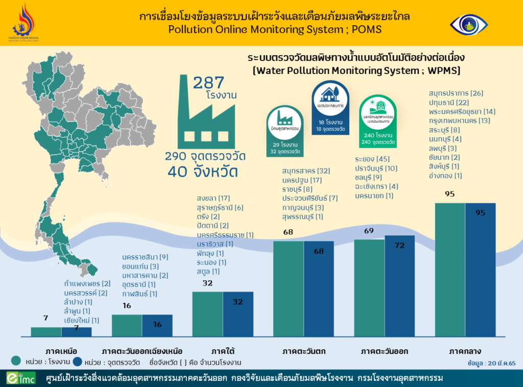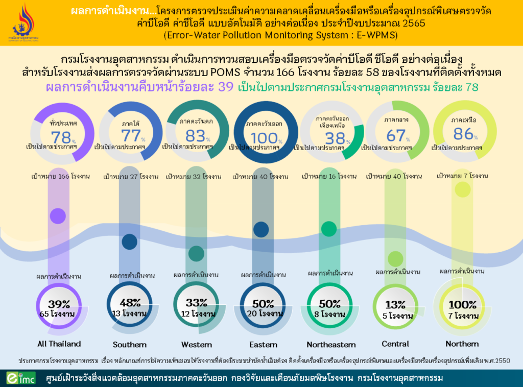 นายวันชัย พนมชัย อธิบดีกรมโรงงานอุตสาหกรรม เปิดเผยว่า ตามประกาศกระทรวงอุตสาหกรรม เรื่อง กำหนดให้โรงงานที่ต้องมีระบบบำบัดน้ำเสีย ต้องติดตั้งเครื่องมือหรือเครื่องอุปกรณ์พิเศษและเครื่องมือหรือเครื่องอุปกรณ์เพิ่มเติม พ.ศ. 2547 และที่แก้ไขเพิ่มเติม กำหนดให้โรงงานที่ระบายน้ำทิ้งออกนอกโรงงานตั้งแต่ 500 ลูกบาศก์เมตรต่อวันขึ้นไป หรือมีปริมาณความสกปรกในรูปของบีโอดีช่วงไหลเข้า (Influent BOD Load) 4,000 กิโลกรัมต่อวันขึ้นไป ต้องติดตั้งเครื่องมือหรือเครื่องอุปกรณ์พิเศษและเครื่องมือหรือเครื่องอุปกรณ์เพิ่มเติม และเชื่อมโยงข้อมูลเข้าสู่ระบบตรวจวัดมลพิษทางน้ำแบบอัตโนมัติอย่างต่อเนื่อง (Water Pollution Monitoring System ; WPMS) โดยจำนวนโรงงานที่เข้าข่ายทั่วประเทศมีจำนวนทั้งสิ้น 287 โรงงานใน 40 จังหวัด และเพื่อให้การกำกับดูแลเป็นไปอย่างมีประสิทธิภาพ รวมทั้งข้อมูลที่รายงานมายัง กรอ. มีความน่าเชื่อถือ เจ้าหน้าที่จึงดำเนินการตรวจสอบค่าความคลาดเคลื่อนของเครื่องมือตรวจวัดมลพิษระยะไกลโดยเก็บตัวอย่างน้ำทิ้งที่ระบายออกจากโรงงานและตรวจวัดวิเคราะห์คุณภาพของน้ำทิ้งโดยห้องปฏิบัติการ เพื่อประเมินหาค่าความคลาดเคลื่อนในการรายงานค่าบีโอดีหรือซีโอดีของเครื่องมือตรวจวัดมลพิษระยะไกล (WPMS) โดยผลการทวนสอบในช่วง 6 เดือนที่ผ่านมา (ตุลาคม 2564 ถึงมีนาคม 2565 ) พบว่า 50 จาก 65 โรงงานที่ทำการตรวจสอบ เป็นไปตามเกณฑ์ที่กฎหมายกำหนด ส่วนโรงงานที่ไม่เป็นไปตามเกณฑ์ กรอ. ได้สั่งการปรับปรุงแก้ไขเครื่องมือตรวจวัดมลพิษระยะไกลอย่างเร่งด่วน