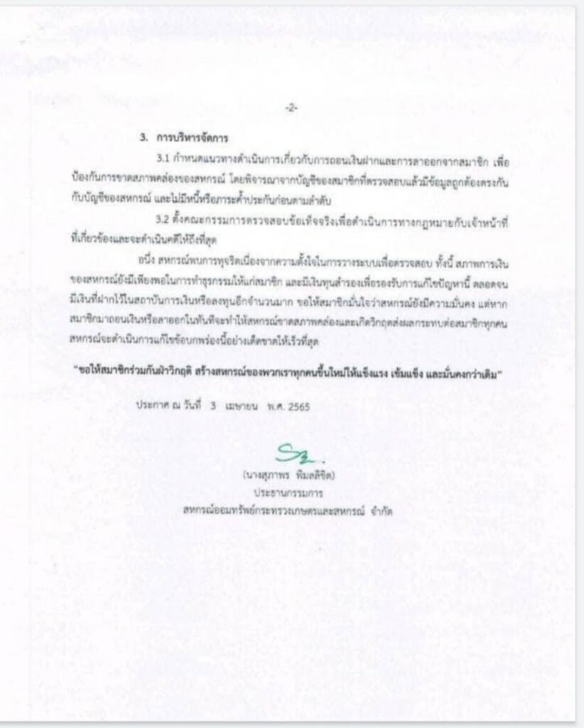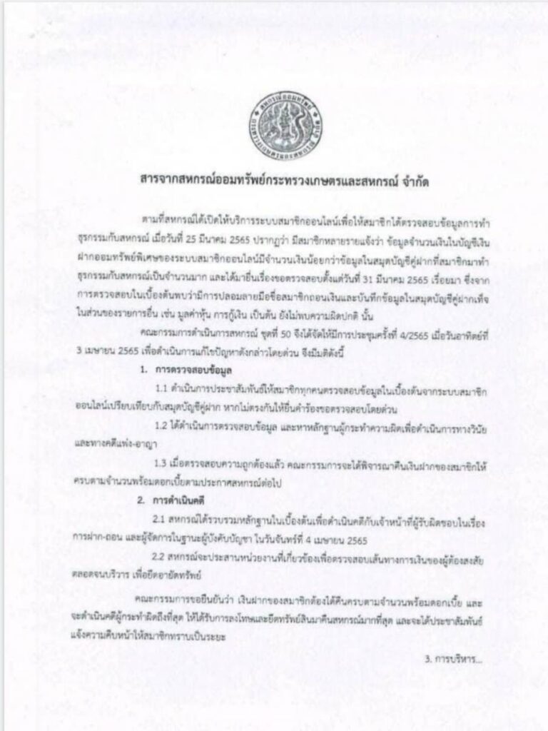 สำหรับสหกรณ์ออมทรัพย์กระทรวงเกษตรและสหกรณ์ได้ออกหนังสือชี้แจงต่อกรณีดังกล่าวว่าตรวจสอบพบเนื่องจากสหกรณ์ได้เปิดบริการให้สมาชิกตรวจสอบเงินผ่านระบบออนไลน์แล้วสมาชิกพบว่ายอดเงินน้อยกว่าจำนวนเงินที่ระบุไว้ในสมุดบัญชีเงินฝากและได้มาขอตรวจสอบเมื่อ 31 มี.ค. ที่ผ่านมา เบื้องต้นพบว่า มีการปลอมลายมือชื่อในการเบิกเงิน ยืนยันว่า สมาชิกจะได้เงินคืนเต็มจำนวนพร้อมดอกเบี้ยอย่างแน่นอน ทั้งนี้สหกรณ์จะรวบรวมรายละเอียดดำเนินคดีกับผู้จัดการสหกรณ์และเจ้าหน้าที่การเงินที่เกี่ยวข้องอย่างถึงที่สุด.-สำนักข่าวไทย