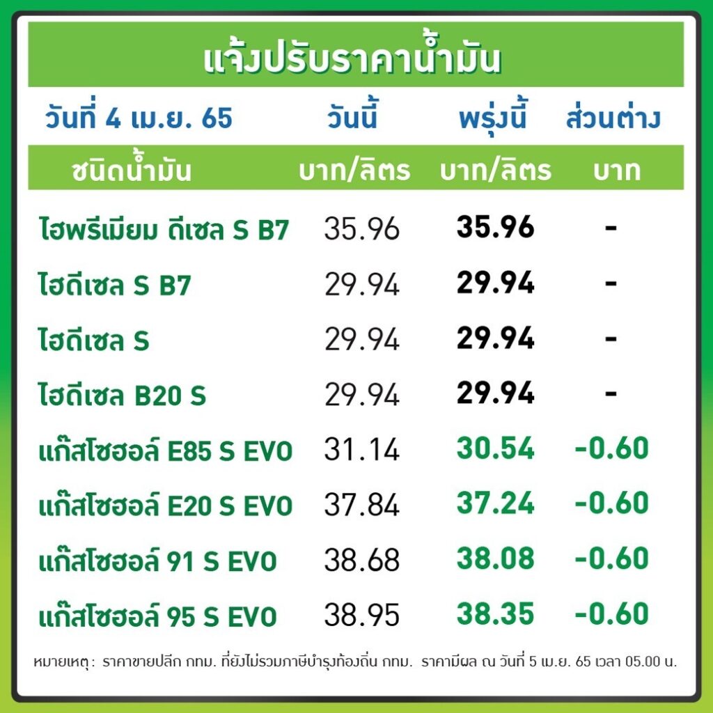 PTT Station ปรับลดราคาขายปลีกน้ำมันกลุ่มเบนซินและแก๊สโซฮอล์ทุกชนิดลง 0.60 บาทต่อลิตร ส่วนกลุ่มดีเซลทุกชนิด คงเดิม มีผล 5 เม.ย.65 เวลา 05.00 น. เป็นต้นไป โดยราคาขายปลีกจะเป็นดังนี้ ULG = 45.76, GSH95 = 38.35, E20 = 37.24, GSH91 = 38.08, E85 = 30.54, HSD- B7= 29.94, HSD-B10 = 29.94, HSD-B20=29.94,ดีเซลพรีเมี่ยม B7 = 35.96 บาทต่อลิตร โดยราคาขายปลีกข้างต้นยังไม่รวมภาษีบำรุงกรุงเทพมหานคร