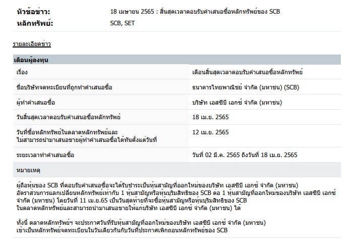 กรุงเทพฯ 7 เม.ย. – ตลาดหลักทรัพย์ฯ เตือนสิ้นสุดเวลาตอบรับคำเสนอซื้อหลักทรัพย์ของ SCB ในวันที่ 18 เม.ย. 2565