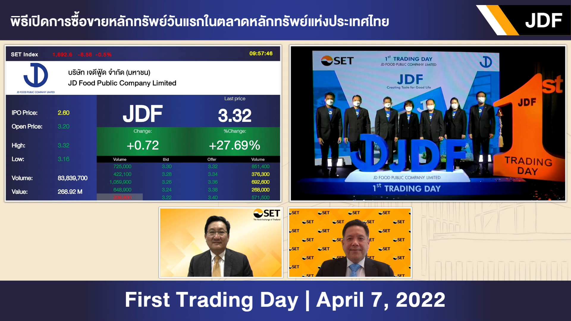 นายภากร ปีตธวัชชัย กรรมการและผู้จัดการ แมนพงศ์ เสนาณรงค์ รองผู้จัดการ หัวหน้าสายงานผู้ออกหลักทรัพย์ ตลาดหลักทรัพย์แห่งประเทศไทย พร้อมด้วย รัตนา เอี้ยประเสริฐศักดิ์ ประธานเจ้าหน้าที่บริหาร และ ธีรบุล หอสัจจกุล กรรมการบริหาร บมจ. เจดีฟู้ด ร่วมพิธีเปิดการซื้อขายวันแรกในตลาดหลักทรัพย์แห่งประเทศไทย ในรูปแบบ Virtual Ceremony ของ บมจ. เจดีฟู้ด ผู้ผลิตเครื่องปรุงรสอาหาร ซอส ไส้ขนม อาหารอบแห้ง ขนมขบเคี้ยวประเภทมะพร้าวอบกรอบ และซุปกึ่งสำเร็จรูป ด้วยมูลค่าหลักทรัพย์ ณ ราคา IPO 1,560 ล้านบาท ในวันที่ 7 เมษายน 2565 โดยใช้ชื่อย่อในการซื้อขายหลักทรัพย์ว่า “JDF”