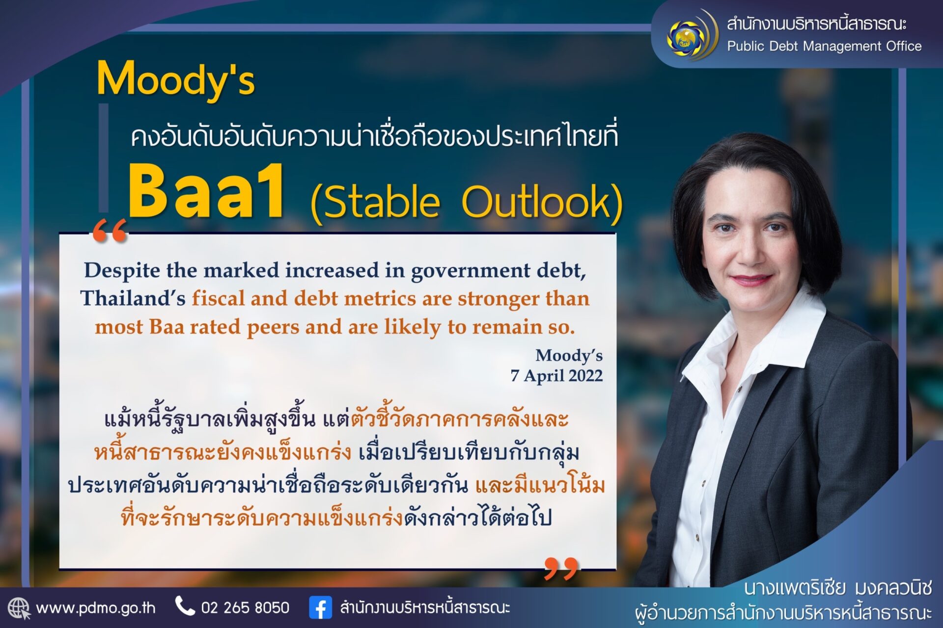 นางแพตริเซีย มงคลวนิช ผู้อำนวยการสำนักงานบริหารหนี้สาธารณะ เปิดเผยว่า Moody’s ประกาศคงอันดับความน่าเชื่อถือของประเทศไทย Baa1 หรือเทียบเท่า BBB+ และคงมุมมองความน่าเชื่อถือของไทย ในระดับมีเสถียรภาพ เพราะมองว่าไทย ดำเนินน นโยบายเศรษฐกิจมหภาค มีประสิทธิภาพ มีความยืดหยุ่น รองรับเหตุรุนแรง ขับเคลื่อน EEC เพื่อดึงการลงทุนเข้าเพิ่มขึ้น Moody’s มองว่า ในช่วง 2- 3 ปีข้างหน้า เมื่อเศรษฐกิจโควิด-19 คลี่คลาย และภาคการท่องเที่ยวจะฟื้นตัวขึ้น จึงคาดว่าเศรษฐกิจไทยปี 2565 ขยายตัวอย่างร้อยละ 3.4 และปี 2566 ขยายตัวร้อยละ 4.8