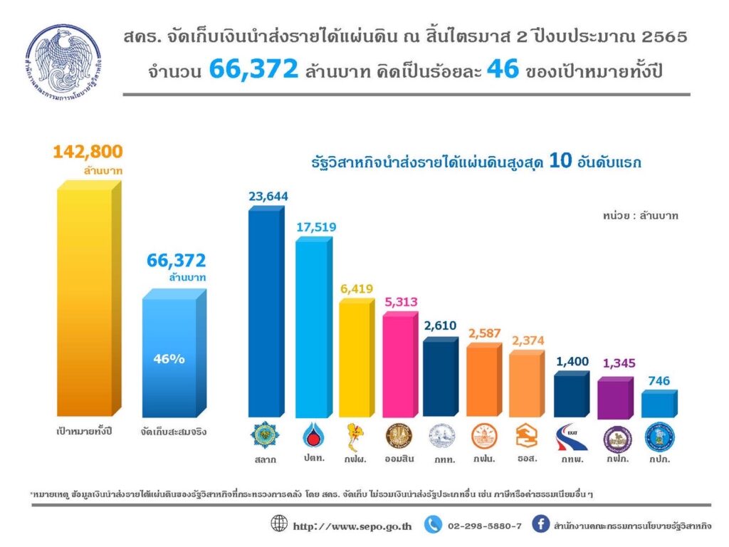 นางปานทิพย์ ศรีพิมล ผู้อำนวยการสำนักงานคณะกรรมการนโยบายรัฐวิสาหกิจ (สคร.) เปิดเผยว่า ณ สิ้นไตรมาส 2 ปีงบประมาณ 2565 (1 ตุลาคม 2564 – 31 มีนาคม 2565) สคร. จัดเก็บเงินนำส่งรายได้แผ่นดิน จากรัฐวิสาหกิจและกิจการที่กระทรวงการคลังถือหุ้นต่ำกว่าร้อยละ 50 รวม วงเงิน 66,372 ล้านบาท สูงกว่าเป้าหมาย 8,521 ล้านบาทหรือคิดเป็นร้อยละ 46 ของเป้าหมายการจัดเก็บในปี 65 จำนวน 142,800 ล้านบาท โดยเงินนำส่งรายได้แผ่นดินอันดับ 1 สำนักงานสลากกินแบ่งรัฐบาล 23,644 ล้านบาท อันดับ 2 บริษัท ปตท. จำกัด (มหาชน) 17,579 ล้านบาทอันดับ 3 การไฟฟ้าฝ่ายผลิตแห่งประเทศไทย 6,419 ล้านบาท และธนาคารออมสิน 5,313 ล้านบาท
