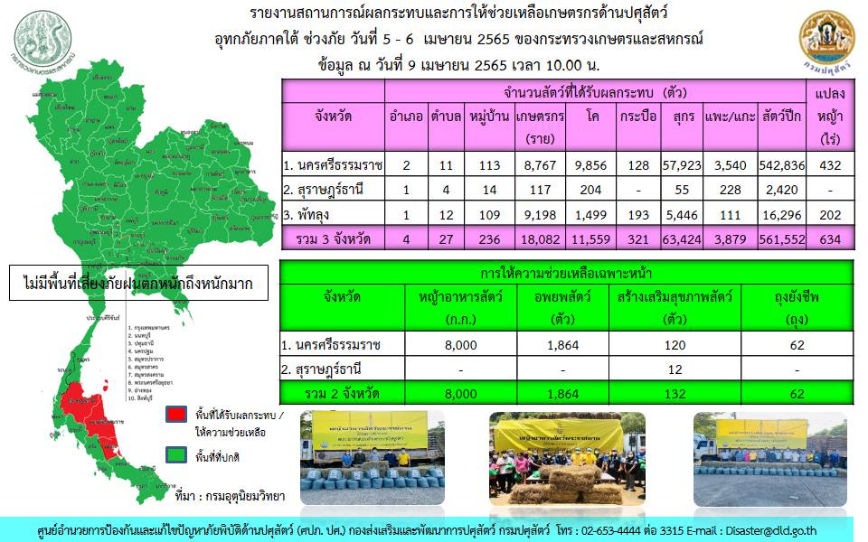 นายเฉลิมชัย ศรีอ่อน รัฐมนตรีว่าการะทรวงเกษตรและสหกรณ์เปิดเผยว่า สั่งการให้ทุกหน่วยงานของกระทรวงเกษตรฯ เร่งช่วยเหลือผู้ประสบอุทกภัยในภาคใต้ หลังจากที่มีฝนตกหนักตั้งแต่วันที่ 4-5 เม.ย. จากการสำรวจความเสียหายด้านการเกษตรมีดังนี้ พืชผล 465 ไร่ ส่วนปศุสัตว์ได้แก่ โค 10 ตัว สุกร 12 ตัว ไก่พื้นเมือง 77 ตัว ด้านประมงได้แก่ ประมงน้ำจืด 30 ราย พื้นที่ 20 ไร่ บ่อกุ้ง 50 ราย พื้นที่ 330 ไร่ ด้านสิ่งสาธารณประโยชน์ ถนน 67 สาย สะพาน 1 แห่ง สะพานน้ำล้น 4 แห่ง คอสะพาน 7 แก่ง และฝายชะลอน้ำ 7 แห่ง