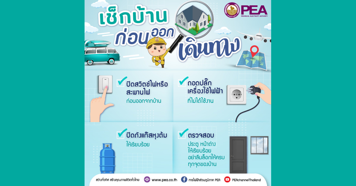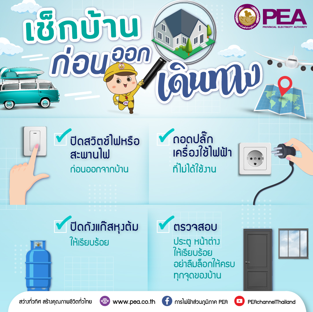 การไฟฟ้าส่วนภูมิภาค (PEA) มีความห่วงใยประชาชนในเรื่องการใช้ไฟฟ้าและการเดินทางในช่วงเทศกาลสงกรานต์ซึ่งถือเป็นช่วงวันหยุดยาวต่อเนื่องเป็นประจำทุกปี และประชาชนส่วนใหญ่เดินทางไปต่างจังหวัด เพื่อความปลอดภัยในการใช้ไฟฟ้าในช่วงวันหยุดยาว