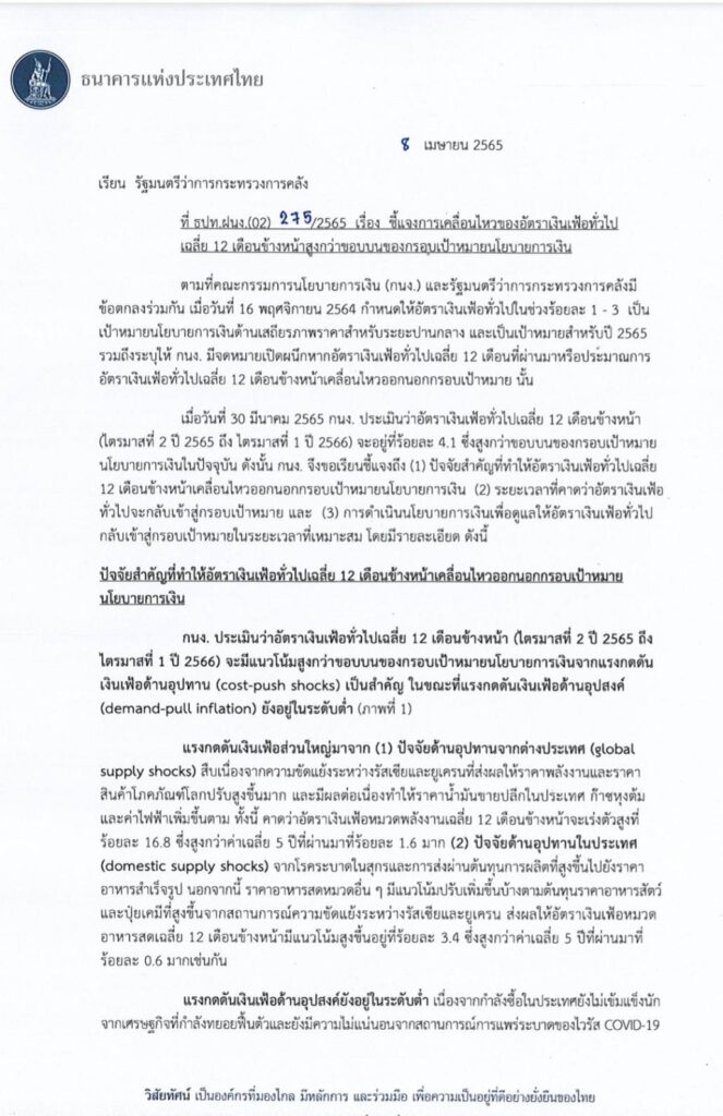 นายเศรษฐพุฒิ สุทธิวาทนฤพุฒิ ผู้ว่าการธนาคารแห่งประเทศไทย(ธปท.) ได้ทำจดหมาย เปิดผนึกถึง รัฐมนตรีว่าการกระทรวงการคลัง ลงวันทึ่ 8 เม.ย. 65 เพื่อ ชี้แจงการเคลื่อนไหวของอัตราเงินเฟ้อทั่วไปเฉลี่ย 12 เดือนข้างหน้าสูงกว่าขอบบนของกรอบเป้าหมายนโยบายการเงิน จากที่ คณะกรรมการนโยบายการเงิน (กนง.) และรัฐมนตรีว่าการกระทรวงการคลังมีข้อตกลงร่วมกัน เมื่อวันที่ 16 พฤศจิกายน 2564 กำหนดให้อัตราเงินเฟ้อทั่วไปในช่วง 1 – 3 % เป็นเป้าหมายนโยบายการเงินด้านเสถียรภาพราคาสำหรับระยะปานกลาง และเป็นเป้าหมายสำหรับปี 2565
