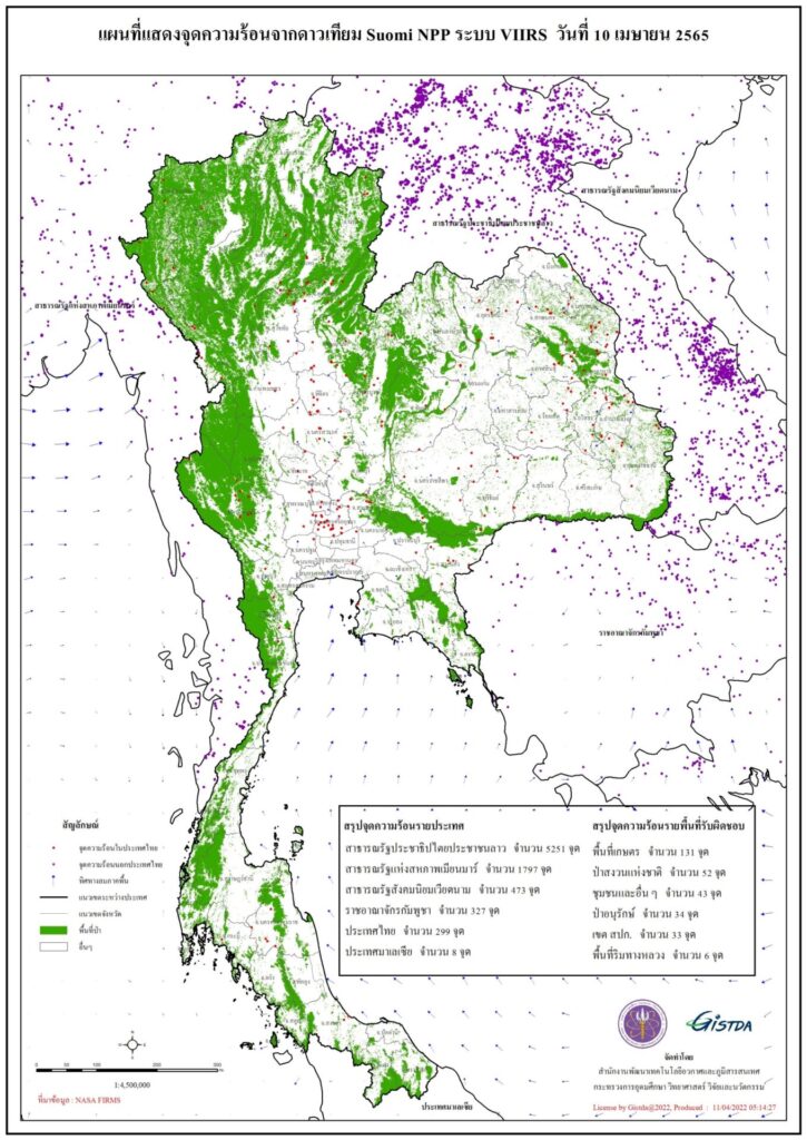 ข้อมูลดังกล่าวสอดคล้องกับข้อมูลจากซูโอมิ เอ็นพีพี (Suomi NPP) ของระบบเวียร์ (VIIRS) ซึ่งพบจุดความร้อนของประเทศเพื่อนบ้านที่อาจส่งผลกระทบต่อคุณภาพอากาศและค่า PM 2.5 ในประเทศไทย เนื่องจากมีลมพัดฝุ่นละอองและหมอกควันเข้ามา โดยผลการตรวจวัดเมื่อวานนี้ (11 เม.ย.) ลาวมีจุดความร้อนสูงที่สุดต่อเนื่องเป็นวันที่ 9 ซึ่งวานนี้พบ 3,604 จุด อันดับ 2 เมียนมา 3,324 จุด และอันดับ 3 เวียดนาม 420 จุด