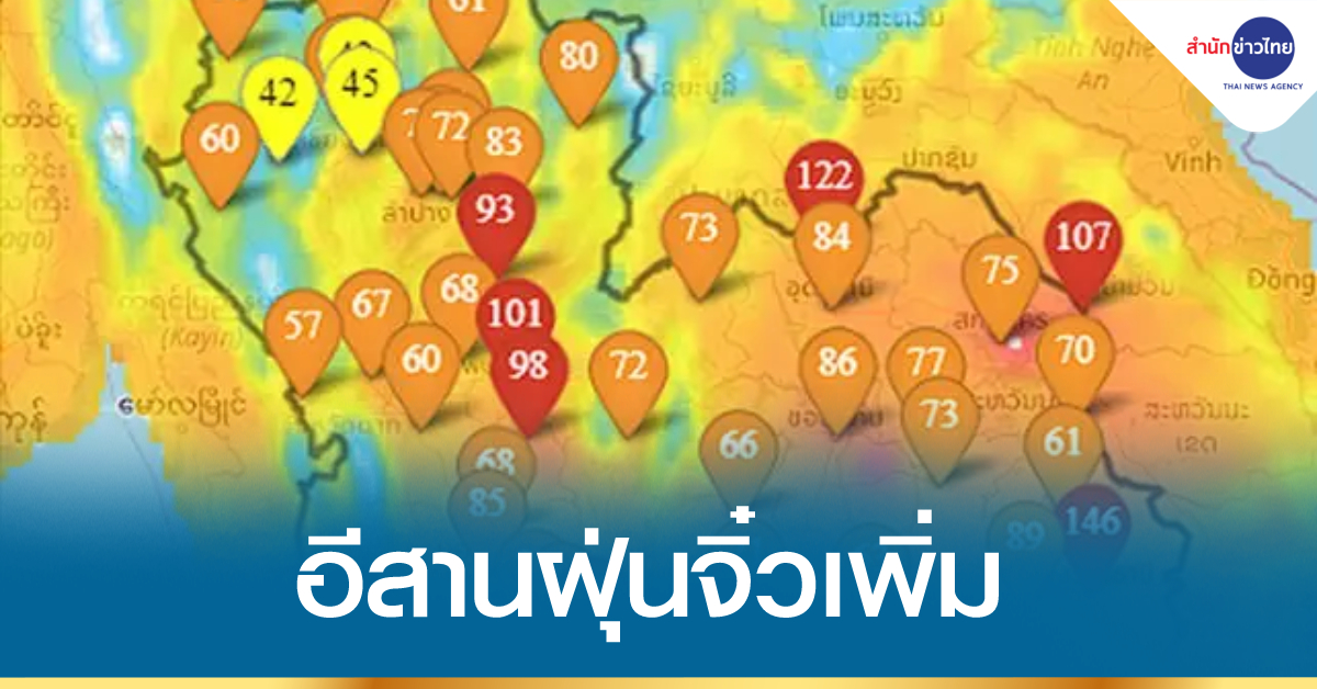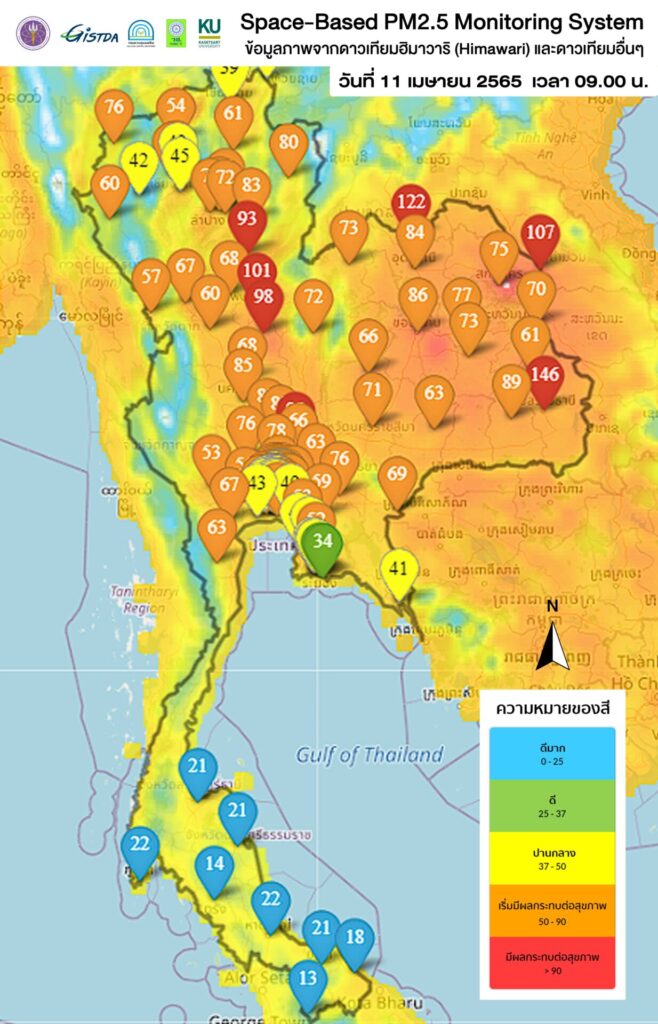 สำนักงานพัฒนาเทคโนโลยีอวกาศและภูมิสารสนเทศ (องค์การมหาชน) หรือ GISTDA ระบุว่า ข้อมูลจากดาวเทียมฮิมาวาริ (Himawari) บ่งชี้ว่า ค่าเฉลี่ยปริมาณฝุ่นละอองขนาดเล็ก PM 2.5 ช่วงเช้าวันนี้ (12 เม.ย.) หลายพื้นที่ลดลง แต่ในภาคตะวันออกเฉียงเหนือยังอยู่ในระดับเริ่มมีผลกระทบต่อสุขภาพ (พื้นที่สีส้ม) ถึงระดับมีผลกระทบต่อสุขภาพ (พื้นที่สีแดง) โดยเฉพาะจังหวัดหนองคาย อุบลราชธานี และนครพนม