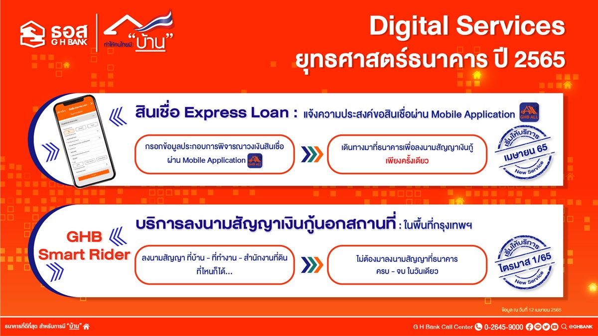 ด้านการปรับกระบวนการให้บริการลูกค้าด้วย Digital Services ตามแผนยุทธศาสตร์ของธนาคารในปี 2565 ล่าสุด ธอส. เตรียมเปิดให้ลูกค้าแจ้งความประสงค์ขอยื่นกู้จากที่ไหนก็ได้ผ่าน Mobile Application : GHB ALL (ปัจจุบันอยู่ระหว่างการพัฒนาเป็น Mobile Application : GHB ALL GEN) ด้วยเมนู “สินเชื่อ Express Loan” เพียงกรอกข้อมูลที่ธนาคารใช้ประกอบการพิจารณาวงเงินสินเชื่อไม่กี่ขั้นตอน และเดินทางมาที่ธนาคารเพื่อลงนามสัญญาเงินกู้เพียงครั้งเดียว โดยจะเริ่มให้บริการลูกค้าอย่างเป็นทางการ ภายในเดือนเมษายน 2565 นอกจากนี้ ในช่วงไตรมาส 1 ของปี 2565 ลูกค้าในพื้นที่กรุงเทพฯ สามารถเลือกลงนามสัญญาเงินกู้นอกสถานที่ทำการของธนาคารด้วยโครงการใหม่ คือ “GHB Smart Rider” การลงนามสัญญาเงินกู้ที่บ้าน ที่ทำงาน ร้านอาหาร ร้านกาแฟ หรือที่สำนักงานที่ดิน โดยไม่ต้องเดินทางมาที่ธนาคาร ขณะที่ภายในไตรมาสที่ 2 ของปี 2565 ลูกค้ากลุ่มสวัสดิการที่ทำนิติกรรม ณ สำนักงานที่ดิน และจดทะเบียนจำนองกับธนาคารเรียบร้อยแล้ว สามารถนำโฉนดที่ดินตัวจริงกลับบ้านได้ทันที จากเดิมที่ลูกค้าจะได้รับเป็นสำเนาโฉนดที่ดิน จนกว่าจะปิดบัญชีเงินกู้แล้วเท่านั้น ทั้งนี้ ด้วยบริการที่ตรงกับความต้องการของลูกค้า ทำให้ ณ ไตรมาสที่ 1 ของปี 2565 ธนาคารมีจำนวนการทำธุรกรรมผ่าน Mobile Application : GHB ALL คิดเป็นสัดส่วนสูงถึง 70.02% ของจำนวนธุรกรรมทั้งหมด และคาดว่าจะเพิ่มขึ้นเป็นไม่ต่ำกว่า 80% ได้ตามเป้าหมายที่กำหนดไว้ภายในสิ้นปี 2565. – สำนักข่าวไทย