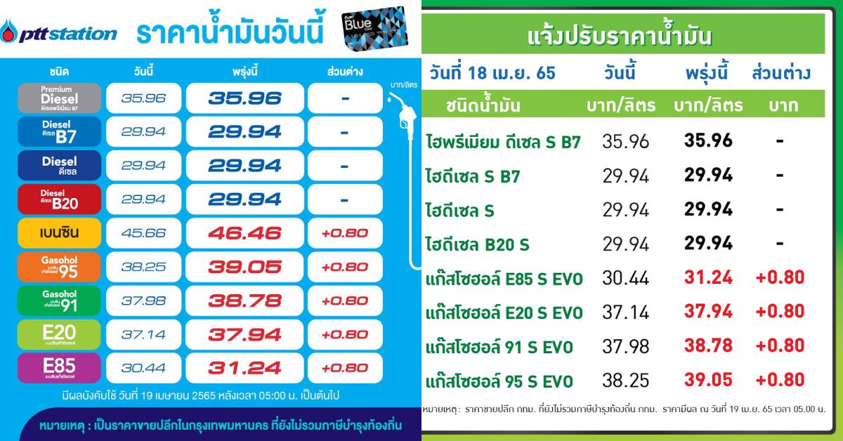 PTT Station ราคาขายปลีกจะเป็นดังนี้ ULG = 46.46, GSH95 = 39.05, E20 = 37.94, GSH91 = 38.78, E85 = 31.24, HSD- B7= 29.94, HSD-B10 = 29.94, HSD-B20=29.94,ดีเซลพรีเมี่ยม B7 = 35.96 บาทต่อลิตร โดยราคาขายปลีกข้างต้นยังไม่รวมภาษีบำรุงกรุงเทพมหานคร.-สำนักข่าวไทย