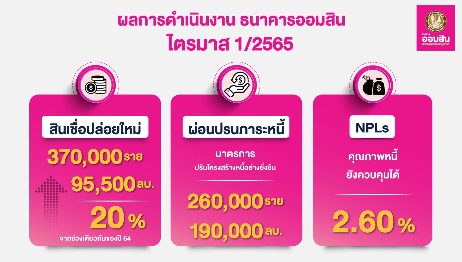 กรุงเทพฯ 19 เม.ย.- ออมสิน เผยไตรมาส 1 ปี 65 ปล่อยสินเชื่อใหม่ 95,500 ล้านบาท เน้นช่วยรายย่อยและผู้ประกอบการผ่านวิกฤติ คาดช่วยเหลือลูกหนี้กว่า 447,000 ราย