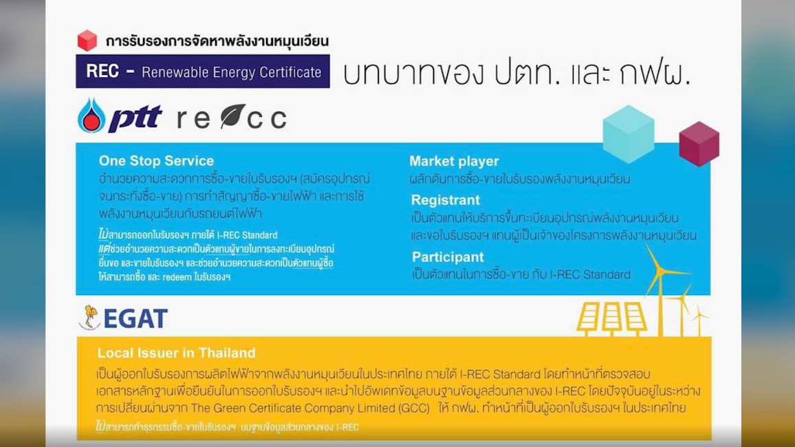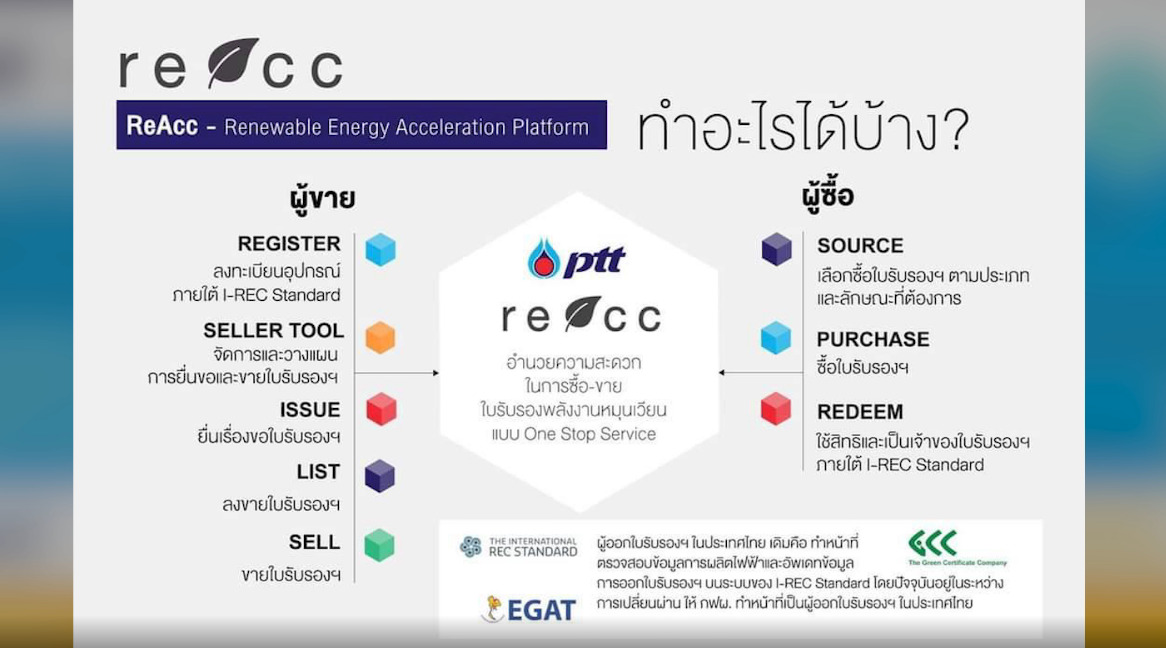 ReAccขณะนีัมีผู้ซื้อใบรับรองพลังงานหมุนเวียนแล้ว 9 ราย รวม 40,000 REC และปีนี้ตั้งเป้า 250,000 REC ซึ่งReAcc บริการ ซื้อขายไฟฟ้าทั้งในรูปแบบ Corporate Power Purchase Agreement (CPPA) และพลังงานหมุนเวียนกับยานยนต์ไฟฟ้า เป็นไปตามมาตรฐานการประกาศรับรองการใช้พลังงานทดแทนระดับนานาชาติ I-REC Standard แบบครบวงจร..และการพัฒนาธุรกิจนี้สอดคล้อง ตามกลยุทธ์ New S-Curve ของ ปตท.