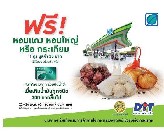 ด้าน บมจ. บางจาก คอร์ปอเรชั่น แจ้งว่าบางจากฯ ร่วมช่วยเหลือเกษตรกรผู้ปลูกพืชหัวสามชนิดได้แก่ หอมแดง หอมใหญ่ และกระเทียม ที่ออกมาพร้อมกันจำนวนมากตามฤดูกาล จึงได้รับซื้อพืชหัวสามชนิดดังกล่าวนำมาสมนาคุณลูกค้าโดยสมาชิกบางจากเติมน้ำมันทุกชนิดตั้งแต่ 300 บาทขึ้นไป รับฟรี กระเทียม หอมแดง หรือหอมใหญ่ (อย่างใดอย่างหนึ่ง) จำนวน 1 ถุง มูลค่า 25 บาท ตั้งแต่ 22 – 24 เมษายน หรือจนกว่าของจะหมดที่สถานีบริการน้ำมันบางจากในเขตกรุงเทพฯ สมุทรปราการ นนทบุรี และปทุมธานี ที่ร่วมรายการ. -สำนักข่าวไทย