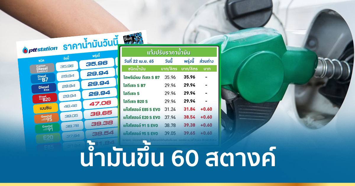 กทม. 22 เม.ย.- ขยับอีก! พรุ่งนี้ 23 เม.ย. น้ำมันเบนซิน-แก๊สโซฮอล์ ขึ้นอีก 60 สตางค์ ส่วนกลุ่มดีเซลราคาคงเดิม