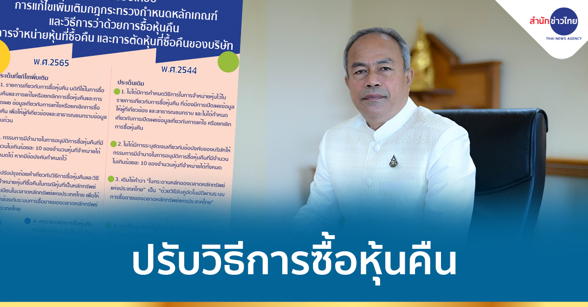 นนทบุรี 23 เม.ย.-กรมพัฒนาธุรกิจการค้าร่วมกับ ก.ล.ต.แก้ไขเพิ่มเติมกฎกระทรวงกำหนดหลักเกณฑ์และวิธีการว่าด้วยการซื้อหุ้นคืน การจำหน่ายหุ้นที่ซื้อคืน และการตัดหุ้นที่ซื้อคืนของบริษัท พ.ศ. 2544 เพื่อให้สอดคล้องกับวิถีการประกอบธุรกิจของบริษัท และสถานการณ์ที่เปลี่ยนแปลงไป เป็นการคุ้มครองผู้ถือหุ้นและผู้ที่เกี่ยวข้องมากขึ้น รวมทั้งเปิดโอกาสให้บริษัทสามารถบริหารสภาพคล่องทางการเงินได้อย่างมีประสิทธิภาพ เป็นประโยชน์ต่อการประกอบธุรกิจของบริษัทในภาพรวม