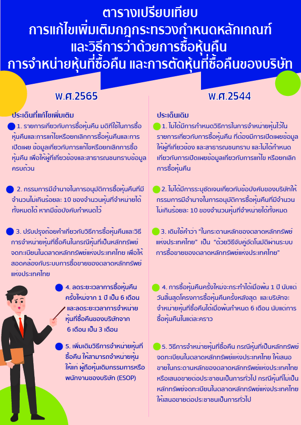 - ปรับปรุงถ้อยคำเกี่ยวกับวิธีการซื้อหุ้นคืนและวิธีการจำหน่ายหุ้นที่ซื้อคืนในกรณีหุ้นที่เป็นหลักทรัพย์จดทะเบียนในตลาดหลักทรัพย์แห่งประเทศไทย เพื่อให้สอดคล้องกับระบบการซื้อขายของตลาดหลักทรัพย์แห่งประเทศไทย