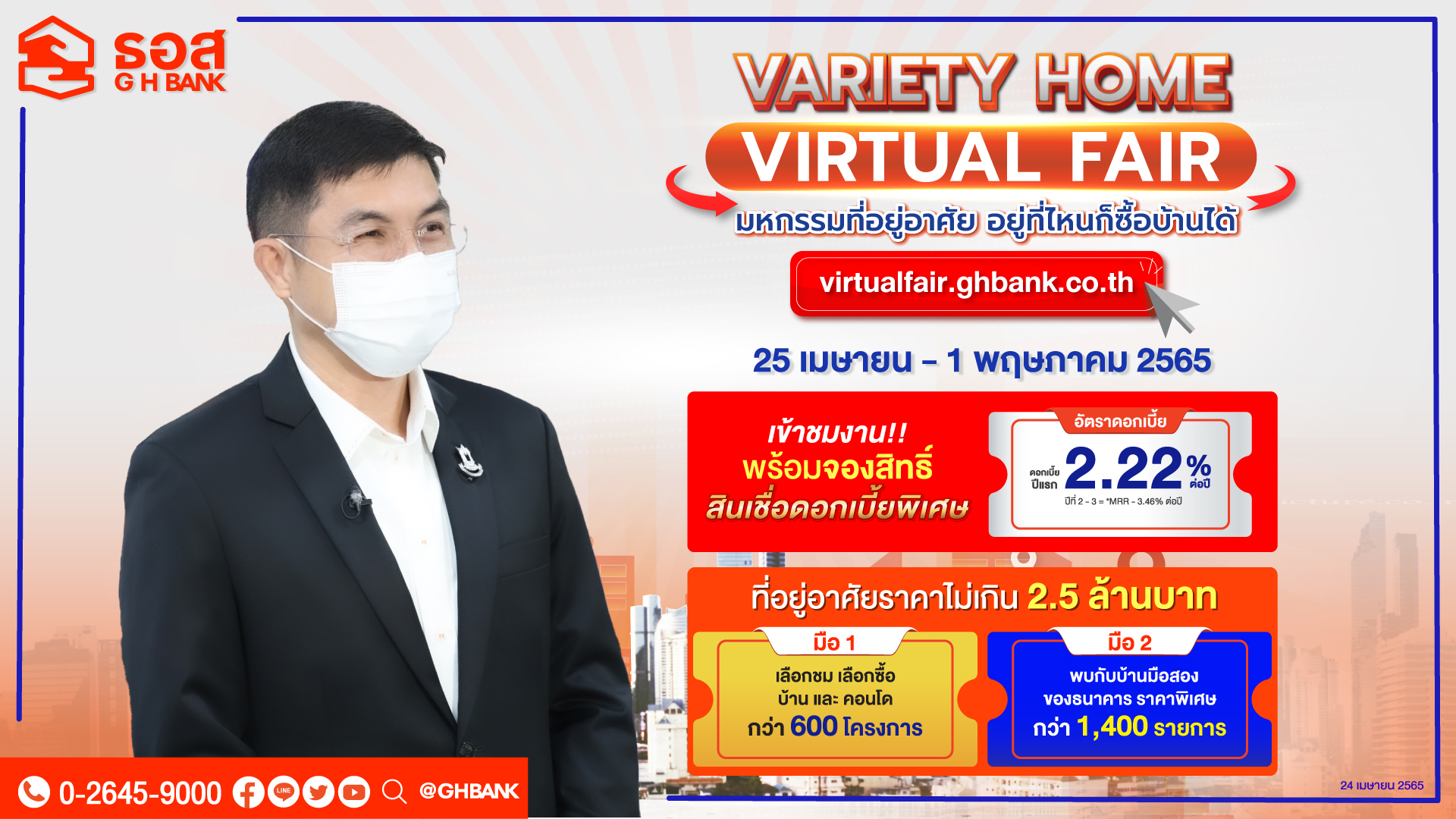 ธอส. 24 เม.ย.-ธนาคารอาคารสงเคราะห์ (ธอส.)จัดงาน VARIETY HOME VIRTUAL FAIR มหกรรมที่อยู่อาศัยออนไลน์จาก ธอส. ทางเว็บไซต์ virtualfair.ghbank.co.th ระหว่างวันที่ 25 เมษายน – 1 พฤษภาคมนี้มี ไฮไลท์สำคัญ คือ บ้านและคอนโดมิเนียมมือหนึ่งทั่วประเทศ โปรโมชั่นสินเชื่ออัตราดอกเบี้ยพิเศษ บ้านมือสองรายการเด่น ทำเลดีและสลากออมทรัพย์ที่ให้ผลตอบแทนดี มีโอกาสถูกรางวัลสูง