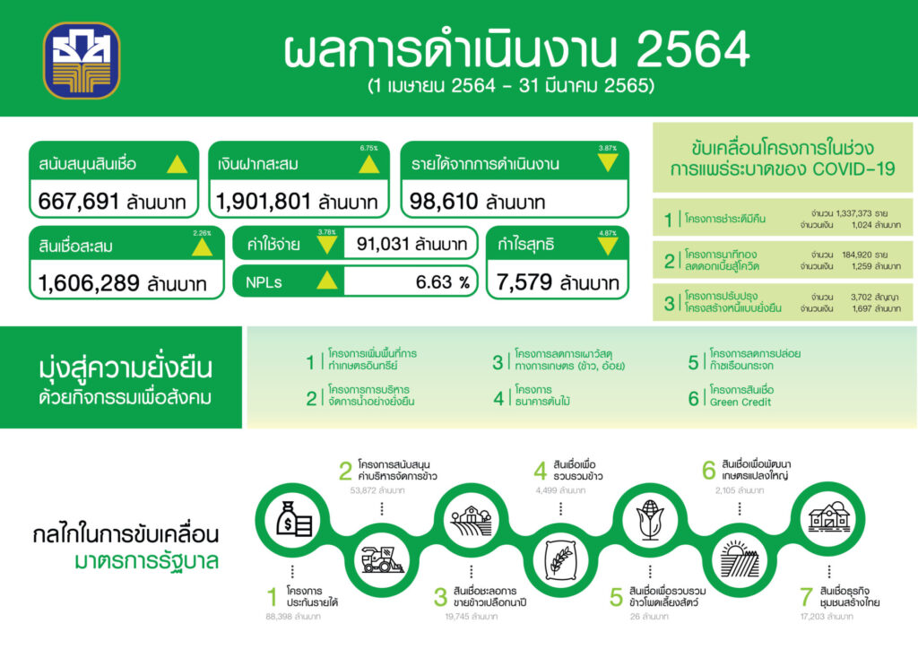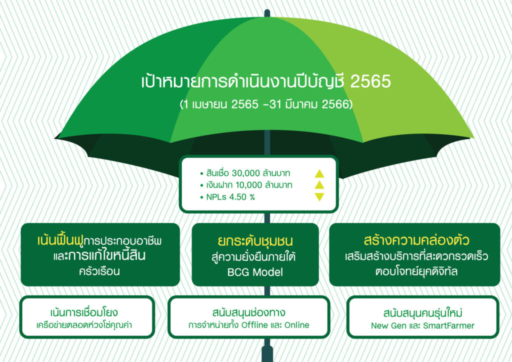 ในปีบัญชี 2565 (1 เมษายน 2565 – 31 มีนาคม 2566) ธ.ก.ส. มุ่งเน้นการเติบโตอย่างมีคุณภาพพร้อมเป็นร่มสนับสนุนและดูแลเกษตรกรอย่างต่อเนื่องและไม่หุบร่ม แม้ต้องเผชิญภาวะวิกฤต วางเป้าหมายสินเชื่อเติบโตเพิ่มขึ้นมากกว่า 30,000 ล้านบาท เงินฝากเติบโตเพิ่มขึ้นมากกว่า 10,000 ล้านบาท และ NPL อยู่ที่ร้อยละ 4.50.-สำนักข่าวไทย
