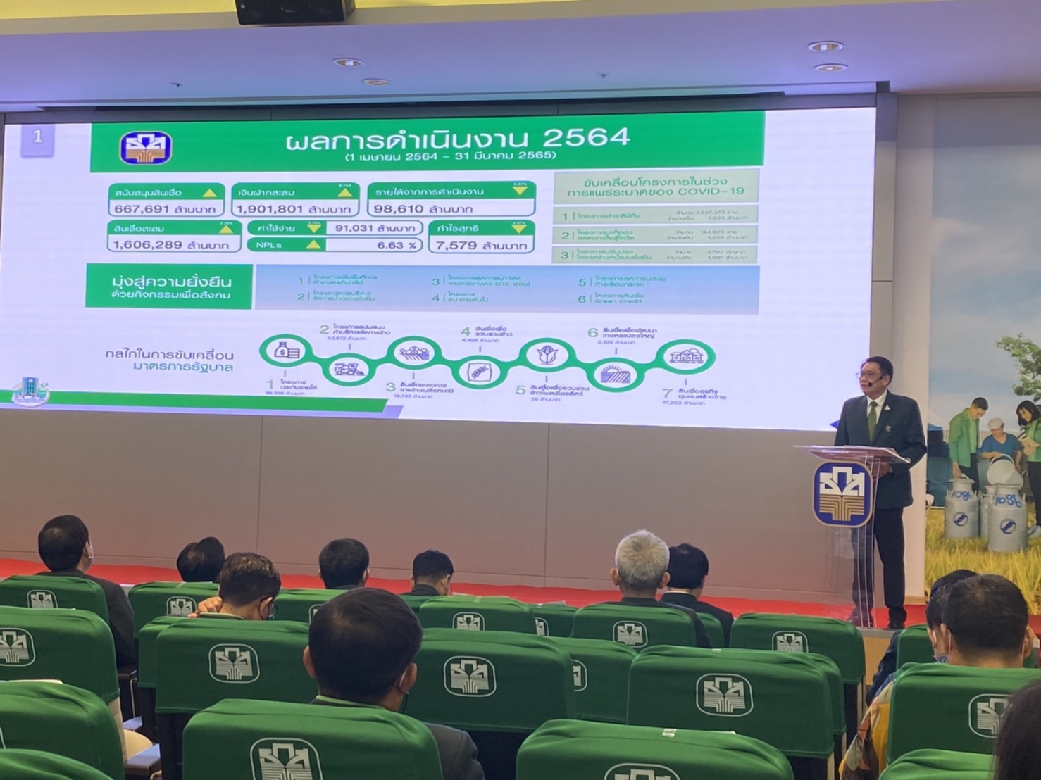 นายธนารัตน์ งามวลัยรัตน์ ผู้จัดการธนาคารเพื่อการเกษตรและสหกรณ์การเกษตร (ธ.ก.ส.) เปิดเผยผลการดำเนินงานปีบัญชี 2564 (1 เมษายน 2564 ถึง 31 มีนาคม 2565) ว่า ธ.ก.ส. ยังคงเติบโตแม้ต้องฝ่าวิกฤต ตอกย้ำความแข็งแกร่งของภาคเกษตรกรรมไทยที่ยังเป็นแรงหนุนสำคัญให้กับระบบเศรษฐกิจ โดยจ่ายสินเชื่อกระตุ้นเศรษฐกิจระหว่างปีกว่า 6.6 แสนล้านบาท วางเป้าปีบัญชี 2565 มุ่งสู่การเป็นธนาคารพัฒนาชนบทที่ยั่งยืน โดยวางมาตรการฟื้นฟูและลดหนี้ครัวเรือนเกษตรกร เสริมองค์ความรู้และนวัตกรรมในการเพิ่มศักยภาพการผลิต การแปรรูป การเชื่อมโยงทางการตลาด เติมความคล่องตัวด้วยบริการทางการเงินที่ทันสมัย ตอบโจทย์ความต้องการในยุคดิจิทัล พร้อมหนุนการพัฒนาและยกระดับชุมชนที่เป็นมิตรกับสิ่งแวดล้อม ภายใต้หลัก BCG