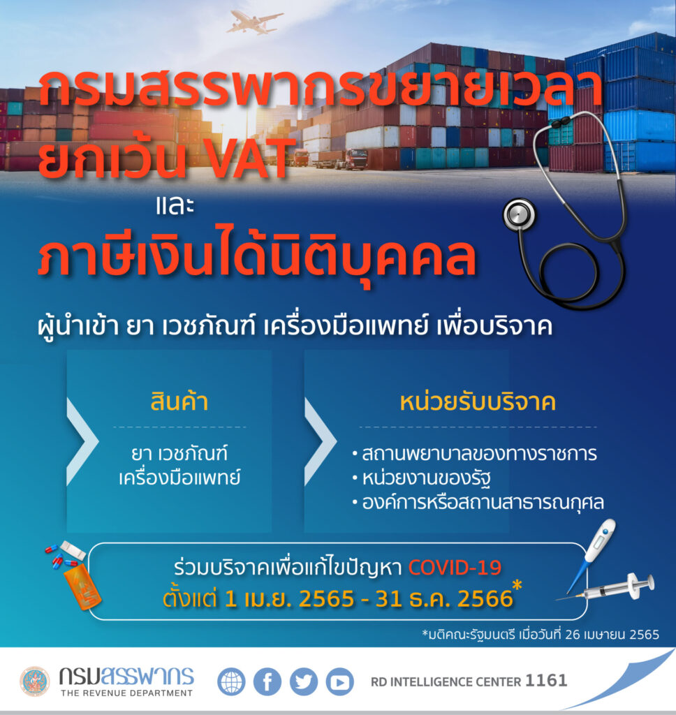 นายอาคม เติมพิทยาไพสิฐ รัฐมนตรีว่าการกระทรวงการคลัง เปิดเผยว่า ที่ประชุม คณะรัฐมนตรี อนุมัติหลักการ ขยายเวลามาตรการภาษีเพื่อสนับสนุนการนำเข้ายา เวชภัณฑ์ และเครื่องมือแพทย์ต้านโรค COVID-19 ที่บริจาคเป็นสาธารณกุศล โดยยกเว้นภาษีมูลค่าเพิ่ม (VAT) สำหรับการนำเข้าสินค้าที่ใช้รักษา วินิจฉัย หรือป้องกันโรคติดเชื้อไวรัสโควิด -19 ได้แก่ ยา เวชภัณฑ์และเครื่องมือแพทย์ต้าน COVID – 19 ที่บริจาคให้แก่สถานพยาบาลของทางราชการ หน่วยงานของรัฐ และองค์การหรือสถานสาธารณกุศล สำหรับการบริจาคตั้งแต่ 1 เมษายน 2565 ถึง 31 ธันวาคม 2566 ช่วยสนับสนุนและสร้างแรงจูงใจให้ภาคเอกชนมีส่วนร่วมกับภาครัฐ แก้ไขสถานการณ์การโควิด -19