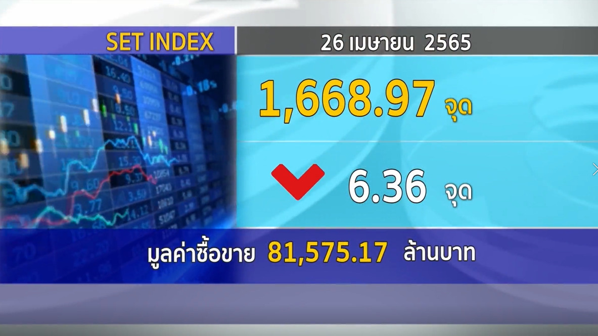 กทม. 26 เม.ย.-ตลาดหลักทรัพย์ ปิดวันนี้ที่ระดับ 1,668.97 จุด ลดลง 6.36 จุด (-0.38%) มูลค่าการซื้อขายราว 81,575.17 ล้านบาท ตลาดหุ้นไทยวันนี้แกว่งผันผวน ส่วนหนึ่งจากค่าเงินบาทอ่อนค่ามาก ประกอบกับกังวลเฟดปรับทิศนโยบายการเงินเร็ว-แรง