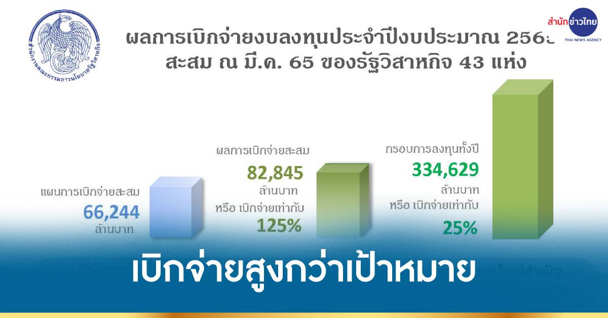 นางปานทิพย์ ศรีพิมล ผู้อำนวยการสำนักงานคณะกรรมการนโยบายรัฐวิสาหกิจ (สคร.) เปิดเผยว่า การเบิกจ่ายงบลงทุนของรัฐวิสาหกิจ 43 แห่ง ตามที่ สคร. กำกับดูแลโดยตรง สำหรับปี 2565 รัฐวิสาหกิจ มีการเบิกจ่ายงบลงทุนสะสม ณ สิ้นเดือนมีนาคม 2565 สูงกว่าเป้าหมาย เบิกจ่ายได้ 82,845 ล้านบาท คิดเป็นร้อยละ 125 ของแผนการเบิกจ่ายสะสมระบบงบประมาณ (ต.ค. 64- มี.ค.65) 34 แห่ง จำนวน 50,702 ล้านบาท หรือคิดเป็นร้อยละ 140 ของแผนเบิกจ่ายสะสม ส่วนรัฐวิสาหกิจระบบปีปฏิทิน (ตั้งแต่เดือนมกราคม 2565 – เดือนมีนาคม 2565) 9 แห่ง จำนวน 32,143 ล้านบาท หรือคิดเป็นร้อยละ 107 ของแผนเบิกจ่ายสะสม