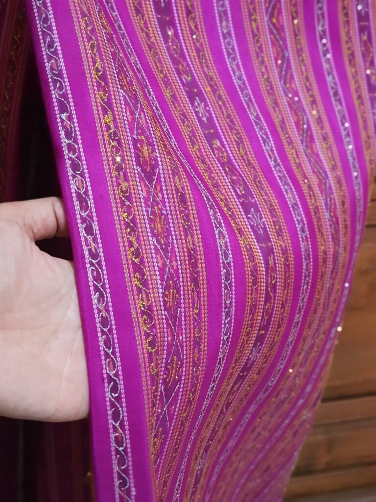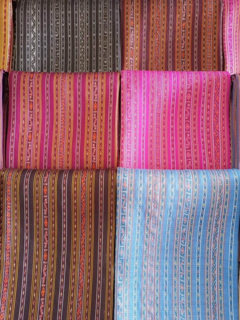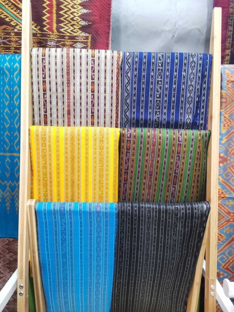 สำหรับ “ผ้าไหมสาเกต” มีการผลิตในพื้นที่จังหวัดร้อยเอ็ด เป็นผ้าไหมมัดหมี่ที่ทอด้วยลายพื้นบ้านโบราณ 5 ลาย ทอต่อกันในผืนเดียว เริ่มจากลายโคมเจ็ด ลายนาคน้อย ลายคองเอี้ย ลายค้ำเพา และลายหมากจับ ตามลำดับ โดยมีเอกลักษณ์สำคัญ คือ ลายนาคน้อย 12 ตัวอยู่ตรงกลาง และลายหมากจับ 3 ลำเป็นช่องไฟของลายพื้น และแต่ละลายจะทอคั่นด้วยผ้าสีชมพูอมม่วงของดอกอินทนิลบก ซึ่งเป็นดอกไม้ประจำจังหวัดร้อยเอ็ด