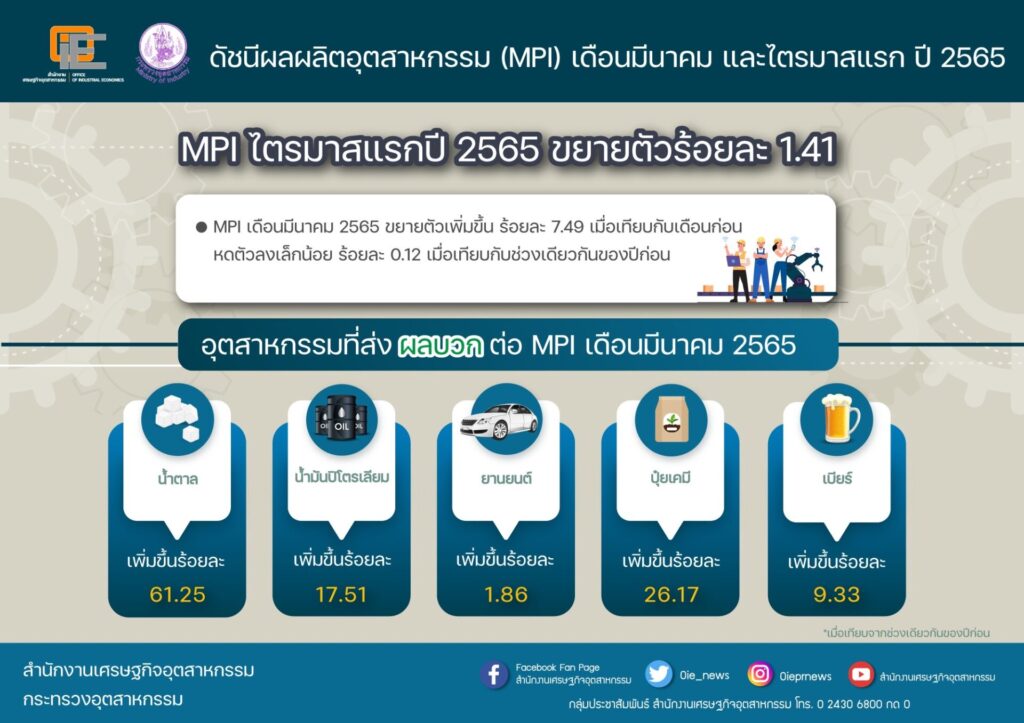 นายสุริยะ จึงรุ่งเรืองกิจ รัฐมนตรีว่าการกระทรวงอุตสาหกรรม (อก.) เปิดเผยว่า ดัชนีผลผลิตอุตสาหกรรม (MPI) เดือนมีนาคม 2565 อยู่ที่ 109.32 ปรับตัวลงเล็กน้อยที่ร้อยละ 0.12 เมื่อเทียบกับช่วงเดียวกันของปีก่อน อย่างไรก็ตามหากเปรียบเทียบกับเดือนก่อนหน้าจะขยายตัวเพิ่มขึ้นที่ร้อยละ 7.49 ส่งผลให้ MPI ไตรมาสแรกปี 2565 ขยายตัวร้อยละ1.41 เมื่อเทียบกับช่วงเดียวกันของปีก่อน ทั้งนี้สำนักงานเศรษฐกิจอุตสาหกรรม (สศอ.) ได้คาดการณ์ว่าเศรษฐกิจภาคอุตสาหกรรมมีแนวโน้มขยายตัวเพิ่มขึ้นจากสัญญาณการส่งออกรวมเดือนมีนาคมขยายตัวร้อยละ 19.54 สูงสุดในรอบ 30 ปี และการส่งออกสินค้าอุตสาหกรรม (ไม่รวมทองคำ อาวุธ รถถังและอากาศยาน) เดือนมีนาคมขยายตัวร้อยละ 7.26 ซึ่งมีมูลค่าส่งออกอยู่ที่ 20,705 ล้านเหรียญสหรัฐ ประกอบกับการนำเข้าสินค้าทุน สินค้าวัตถุดิบและกึ่งสำเร็จรูป (ไม่รวมทองคำ) เดือนมีนาคมที่ขยายตัวเพิ่มขึ้นร้อยละ 5.66 และ 11.52 ตามลำดับ เพื่อจัดเตรียมการผลิตต่อไป