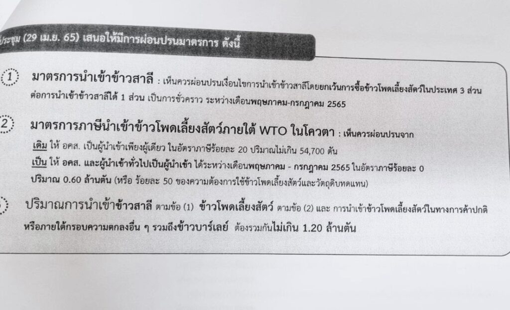 ทั้งนี้ เป็นการกำหนดให้นำเข้าวัตถุดิบผลิตอาหารสัตว์ได้ 3 ช่องทาง มีปริมาณรวมกันไม่เกิน 1,200,000 ตัน แต่เมษายนถึง 31 กรกฎาคม 2565 เพื่อชดเชยส่วนที่ยังขาดให้มีเหลือพอใช้หนึ่งเดือน และให้ตั้งคณะอนุกรรมการ 5 ฝ่าย เพื่อติดตามประเมินการผลดำเนินการทั้งหมดและสามารถเสนอให้ทบทวนหรือปรับปรุงมาตรการต่อไปได้เพื่อความเหมาะสม