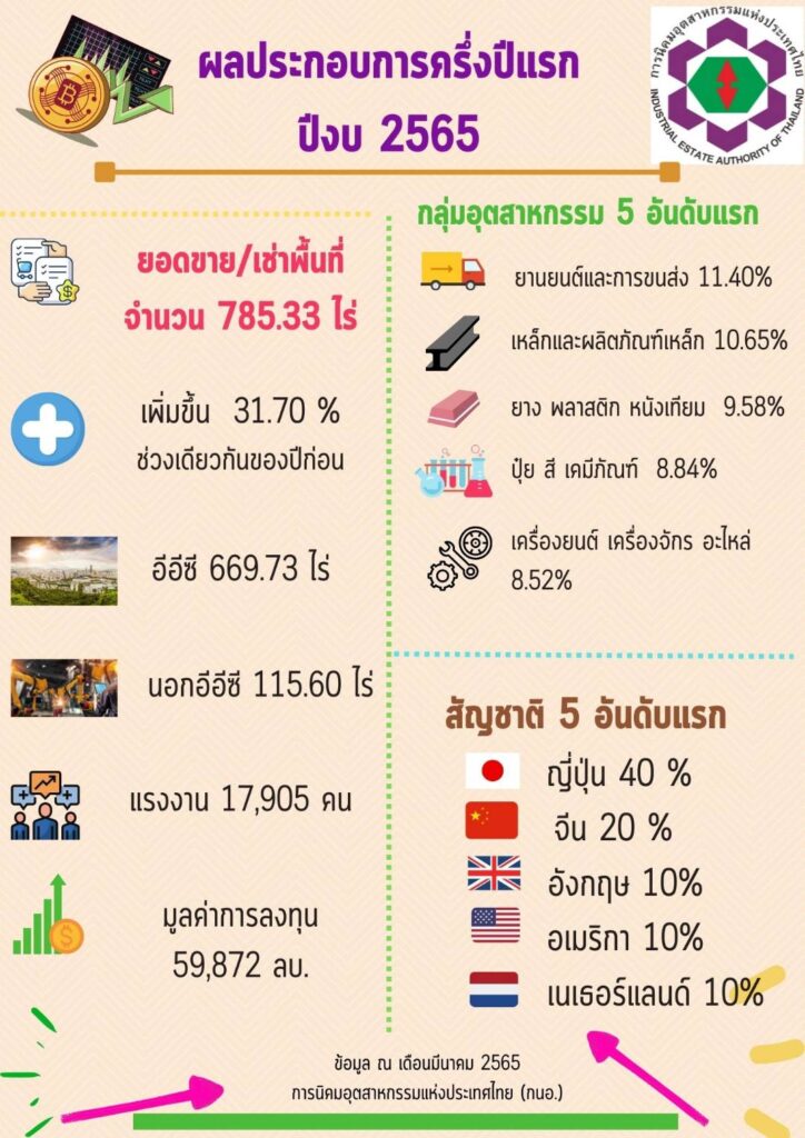 นายวีริศ อัมระปาล ผู้ว่าการการนิคมอุตสาหกรรมแห่งประเทศไทย (กนอ.) เปิดเผยว่า 2 ไตรมาสแรกของปีงบประมาณ 2565 (ต.ค.64 – มี.ค.65) กนอ.มียอดขาย/เช่าพื้นที่นิคมอุตสาหกรรม จำนวน 785.33 ไร่ เพิ่มขึ้นจากช่วงเดียวกันของปีก่อนร้อยละ 31.70 โดยเป็นผลจากความเชื่อมั่นในโครงการขับเคลื่อนโครงสร้างพื้นฐานหลักในพื้นที่เขตพัฒนาพิเศษภาคตะวันออก (อีอีซี) ทั้งโครงการรถไฟความเร็วสูงเชื่อม 3 สนามบิน โครงการพัฒนาท่าอากาศยานนานาชาติอู่ตะเภาและเมืองการบินภาคตะวันออก โครงการพัฒนาท่าเรือแหลมฉบังระยะที่ 3 และโครงการพัฒนาท่าเรืออุตสาหกรรมมาบตาพุด ระยะที่ 3 ซึ่งทั้ง 4 โครงการมีความก้าวหน้าการก่อสร้างและส่งมอบพื้นที่โครงการต่อเนื่องชัดเจน รวมถึงการรับมือกับสถานการณ์การแพร่ระบาดของเชื้อโควิด-19 ที่ประเทศไทยทำได้เป็นอย่างดี ขณะที่แนวโน้มของเศรษฐกิจโลกก็ปรับตัวดีขึ้นเช่นกัน จึงทำให้นักลงทุนตัดสินใจจอง/ชื้อ/เช่าที่ดินในนิคมอุตสาหกรรม ทั้งนิคมอุตสาหกรรมร่วมดำเนินงาน และนิคมอุตสาหกรรมที่ กนอ.ดำเนินการเอง โดยยอดการขาย/เช่านิคมฯ ในพื้นที่อีอีซี มีจำนวน 669.73 ไร่ และนอกพื้นที่อีอีซี จำนวน 115.60 ไร่ มีการแจ้งเริ่มประกอบกิจการ และใบขออนุญาตส่วนขยาย 40 ราย เกิดการจ้างงาน 17,905 คน มูลค่าการลงทุนรวม 6 เดือน 59,872 ล้านบาท