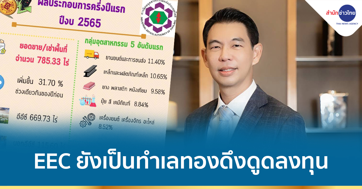 กรุงเทพฯ 2 พ.ค.- กนอ. เผยยอดขาย-เช่าที่ดินพื้นที่นิคมอุตสาหกรรม 6 เดือนแรกปีงบประมาณ 2565 โตขึ้นร้อยละ 31.70 เมื่อเทียบกับช่วงเดียวกันของปีก่อน โดยพื้นที่เขตพัฒนาพิเศษภาคตะวันออก (อีอีซี) ยังคงเป็นทำเลทองดึงดูดการลงทุน ขณะที่นักลงทุนญี่ปุ่นครองแชมป์ลงทุนสูงสุด