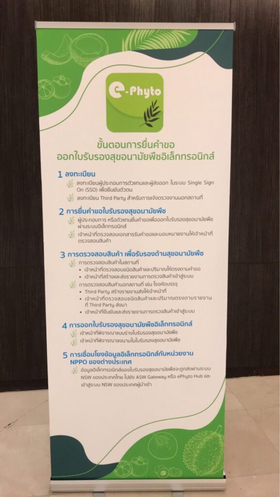 ทั้งนี้นางสาวมนัญญา ไทยเศรษฐ์ รัฐมนตรีช่วยว่าการกระทรวงเกษตรและสหกรณ์มอบนโยบายให้กรมวิชาการเกษตรปรับปรุงการออกใบอนุญาต ใบรับรองผ่านระบบอิเล็กทรอนิกส์ เพื่ออำนวยความสะดวกในการนำเข้า ส่งออก นำผ่าน และโลจิสติกส์ ดังนั้นกรมวิชาการเกษตรจึงออกแบบและพัฒนาระบบใบรับรองสุขอนามัยพืช ePhyto เพื่ออำนวยความสะดวกแก่ผู้ประกอบการส่งออกซึ่งสามารถขอใบรับรองสุขอนามัยพืชจากที่ไหนก็ได้ที่มีอินเตอร์เน็ต ซึ่งช่วยลดเวลาและค่าใช้จ่าย
