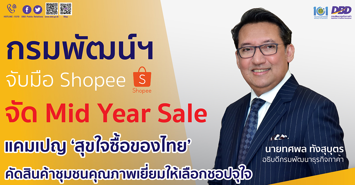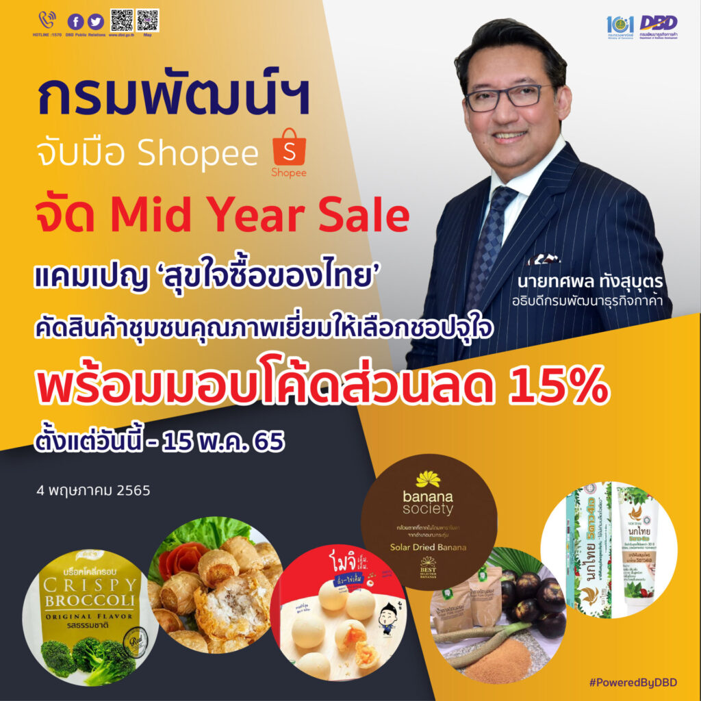 นายทศพล ทังสุบุตร อธิบดีกรมพัฒนาธุรกิจการค้า เผยว่า กรมฯ ร่วมกับ Shopee จัดแคมเปญลดราคากลางปี (Mid Year Sale) ภายใต้แคมเปญ “สุขใจซื้อของไทย” ผ่านแอปพลิเคชั่น Shopee และเว็บไซต์ www.shopee.co.th/dbdonline โดยสามารถเลือกซื้อสินค้าชุมชนคุณภาพดีจากแหล่งผลิตชื่อดัง สินค้าเด่นทั่วประเทศกว่า 4,000 รายการ อาทิ น้ำหวานดอกมะพร้าวอินทรีย์ ชาผักเชียงดา ยาสีฟันกระชายขาว หอยจ๊อปู ไข่เค็มสมุนไพร ฯลฯ พร้อมมอบโค้ดส่วนลด 15% ตั้งแต่วันนี้จนถึง 15 พฤษภาคม 2565