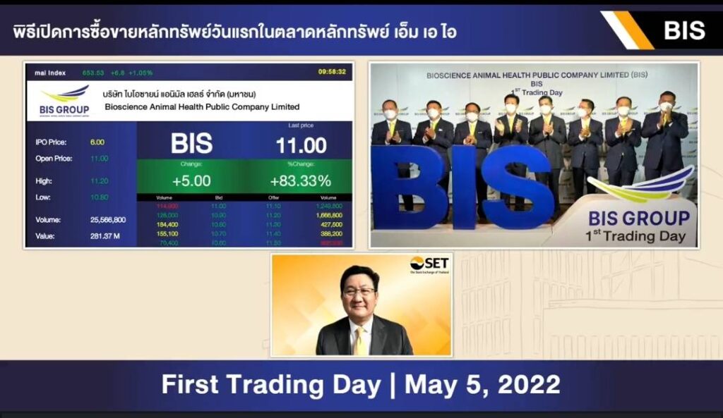 ด้าน BIS เปิดตลาด 11.00บาท เพิ่มขึ้น 83% จากราคา IPO หุ้นละ 6 บาท คิดเป็นมูลค่าระดมทุน 564 ล้านบาท และมีมูลค่าหลักทรัพย์ ณ ราคา IPO 1,884 ล้านบาท บริษัทจะนำเงินที่ได้จากการระดมทุนไปชำระคืนเงินกู้ยืมสถาบันการเงิน ขยายโรงงานและการลงทุนเพิ่มเติมในเครื่องจักร เป็นเงินทุนสนับสนุนงานวิจัยและพัฒนาวัคซีนปศุสัตว์เพื่อต่อยอดการผลิตวัคซีนในเชิงพาณิชย์ และเป็นเงินทุนหมุนเวียน