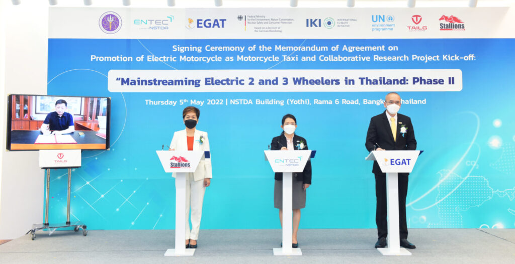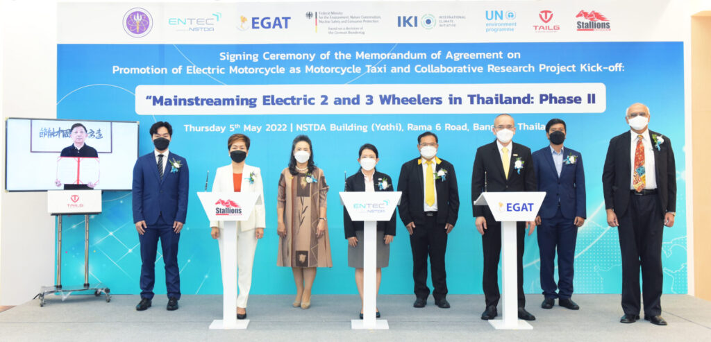 ศูนย์เทคโนโลยีพลังงานแห่งชาติ (เอ็นเทค) จัดพิธีลงนามบันทึกข้อตกลงการส่งเสริมการใช้รถจักรยานยนต์ไฟฟ้าสาธารณะ และการเริ่มโครงการความร่วมมือด้านงานวิจัย โดยมี ดร. สุมิตรา จรสโรจน์กุล ผู้อำนวยการศูนย์เทคโนโลยีพลังงานแห่งชาติ นายสุทธิพงษ์ เฉลิมเกียรติ ผู้ช่วยผู้ว่าการบริหารจัดการความยั่งยืน การไฟฟ้าฝ่ายผลิตแห่งประเทศไทย (กฟผ.) นางอารีรัตน์ ศรีประทาย กรรมการผู้จัดการบริษัท Stallions และ Mr. Li Yao ประธานบริษัท Dongguan Tailing Electric Vehicle Co., Ltd. (TAILG) ร่วมลงนาม โดยมี Dr. Mushtaq Memon, Regional Coordinator for Chemicals and Pollution Action และ Mr. Bert Fabian จาก United Nations Environment Programme (UNEP) เป็นสักขีพยาน