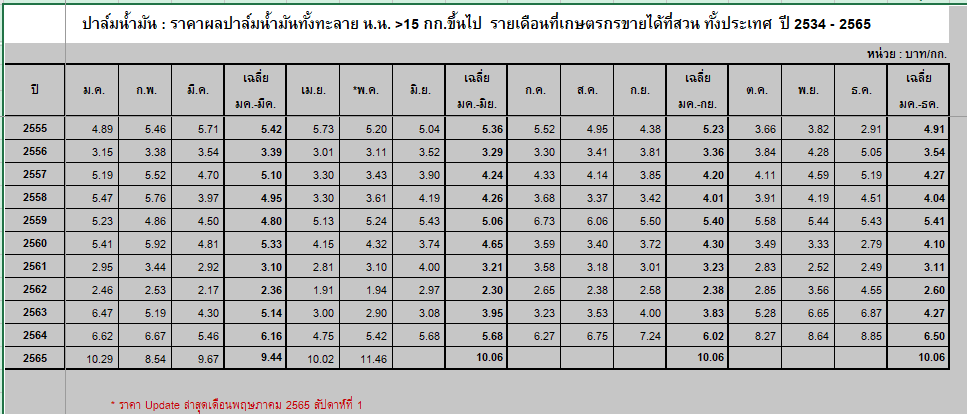สำนักงานเศรษฐกิจการเกษตร (สศก.) ซึ่งเป็นเลขานุการคณะกรรมการนโยบายปาล์มน้ำมันแห่งชาติ (บอร์ดปาล์มน้ำมัน) พยากรณ์สถานการณ์การผลิตปาล์มน้ำมันปี 2565 (พยากรณ์ ณ เดือนกุมภาพันธ์ 2565) ว่า เนื้อที่ให้ผลทั้งประเทศ 6,188,117 ไร่ ผลผลิตต่อไร่  2,843 ตัน และผลผลิต 17,594,169 ตัน ขณะที่ปี 2564 เนื้อที่ให้ผลทั้งประเทศ6,065,404 ไร่ ผลผลิตต่อไร่  2,769 ตัน และผลผลิตรวมทั้งปี 16,794,621 ตัน ซึ่งเมื่อเปรียบเทียบกันแล้วปรากฏว่าพื้นที่ปลูกปาล์มปี 2565 เพิ่มขึ้นเนื่องจากราคาเริ่มปรับสูงขึ้นตั้งแต่ปี 2563 จึงเป็นแรงให้เกษตรกรเพิ่มพื้นที่ปลูก ส่วนผลผลิตต่อไร่ปี 2565 มากกว่าเนื่องจาก 2 ปีก่อนหน้าสถานการณ์แล้งไม่รุนแรง จึงคาดว่า ผลผลิตรวมทั้งปี 2565 จะสูงกว่าปี 2564 ประมาณ 4.7%